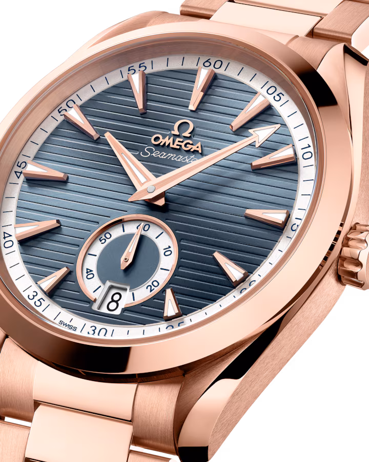 Unworn Omega Seamaster AQUA TERRA 150M CO‑AXIAL MASTER CHRONOMETER SMALL SECONDS 220.50.41.21.03.001. 41 mm, Blue dial, Sedna™ Gold case, Sedna™ Gold bezel, 8917 calibre, Self Winding Movement, 60 Hours power reserve, Sedna™ gold bracelet with Butterfly clasp. Water resistant to 150 m.