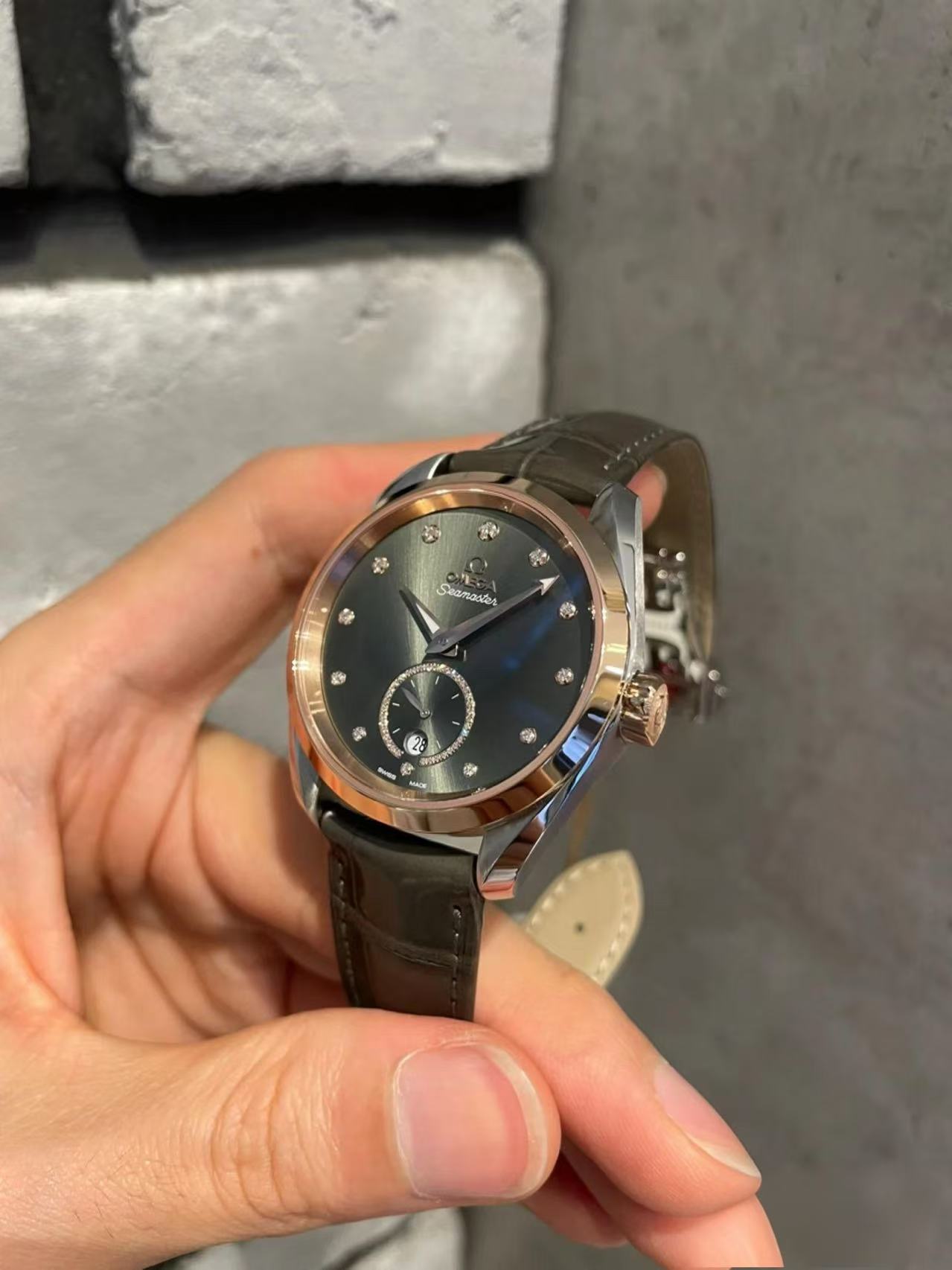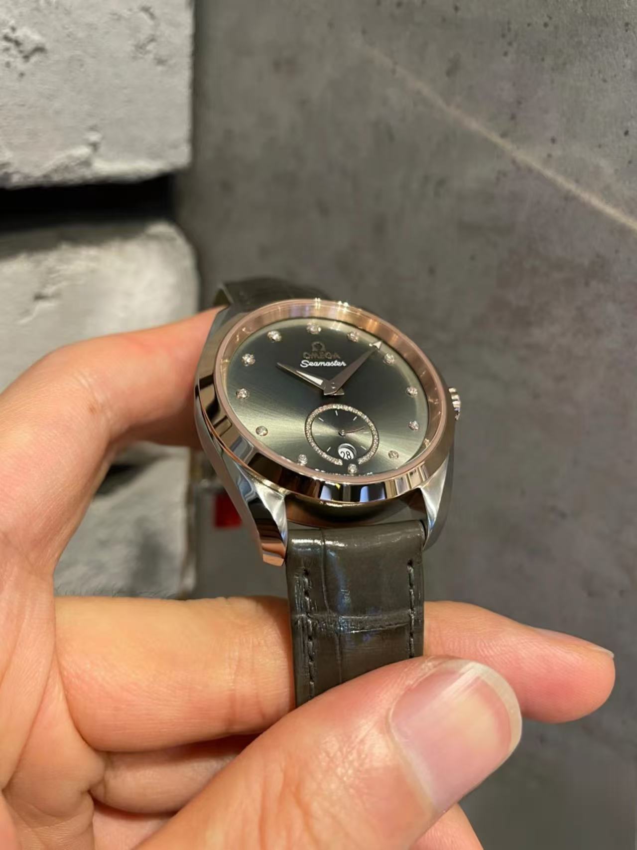 Unworn Omega Seamaster AQUA TERRA 150M CO‑AXIAL MASTER CHRONOMETER SMALL SECONDS 220.23.38.20.60.001. 38 mm, Green dial, Steel ‑ Sedna™ Gold case, Sedna™ Gold bezel, 8802 calibre, Self Winding Movement, 55 Hours power reserve, Leather strap with Foldover clasp. Water resistant to 150 m.