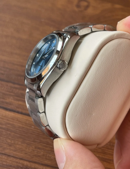 Calibre OMEGA 4061: Quartz movement with "Long Life" feature to maximize the autonomy of the battery. Exclusive red OMEGA logo with rhodium plated parts and circular graining.