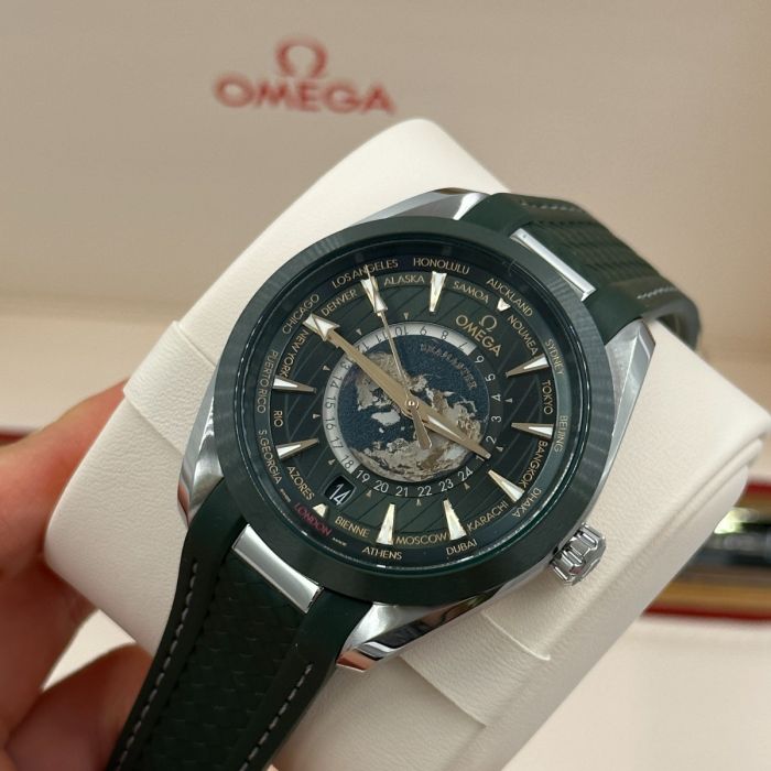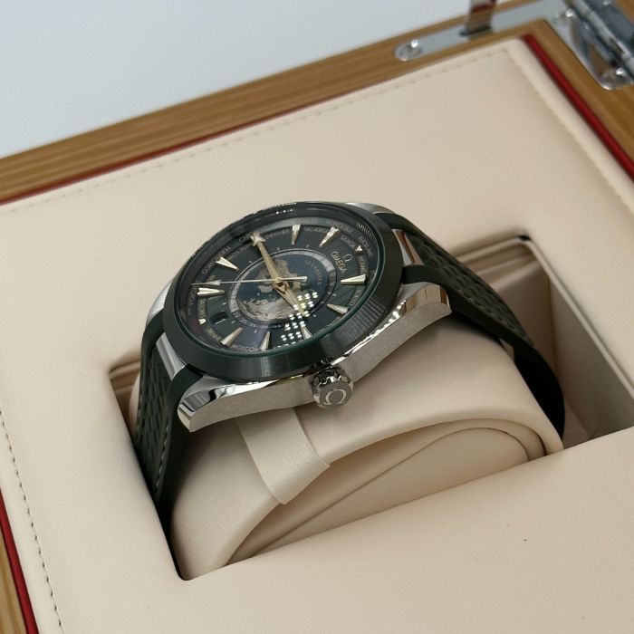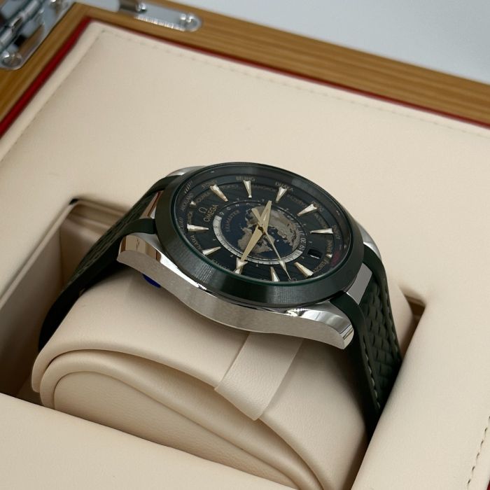 Experience the elegance and precision of the OMEGA Seamaster Aqua Terra Worldtimer, a masterpiece of watchmaking innovation and design. This 43 mm timepiece features a stainless steel case paired with an integrated green rubber strap, enhanced by grey stitching, a polished steel decorative link, and a polished-brushed foldover clasp for ultimate comfort and style.