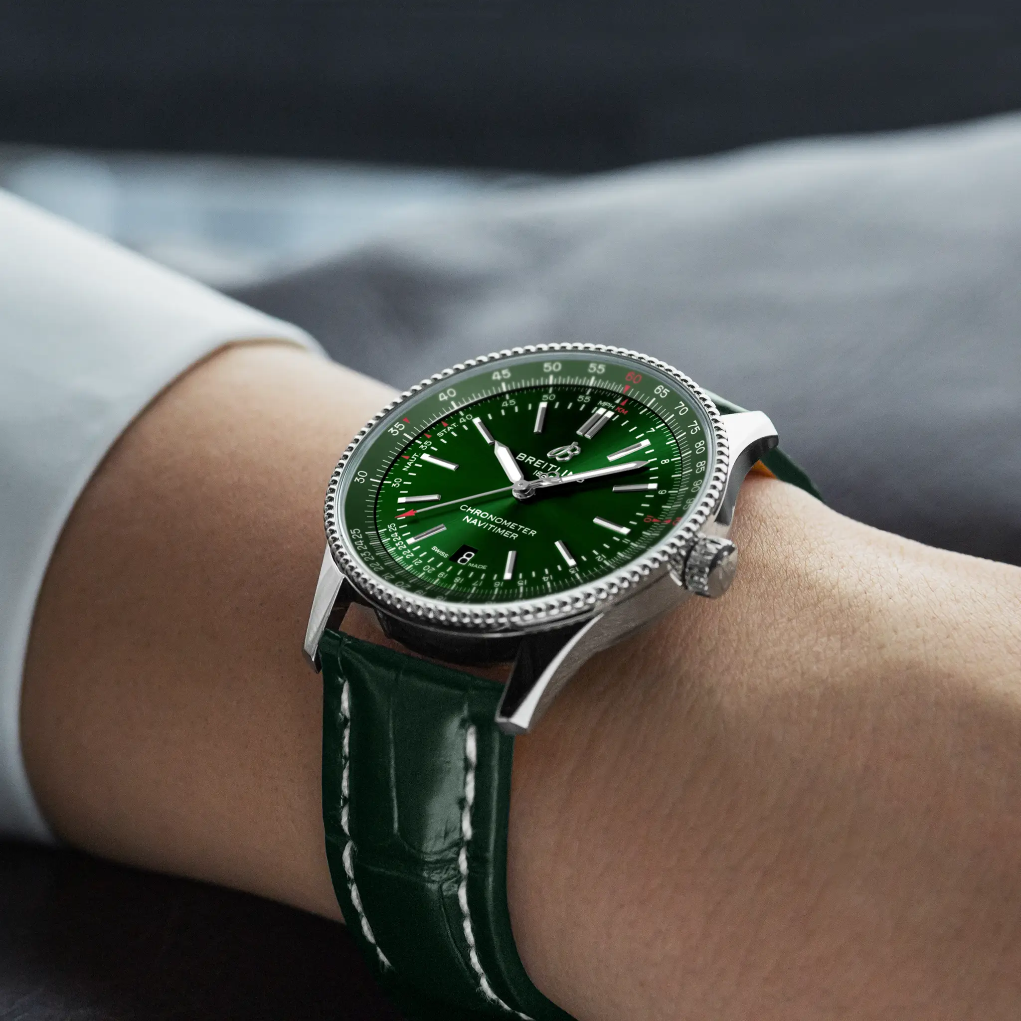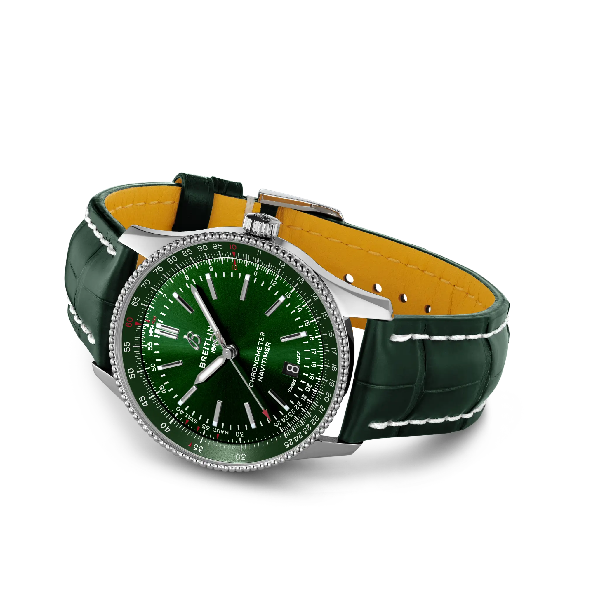 The Breitling Navitimer Automatic 41 A17326361L1P1 combines both style and performance effortlessly. This timeless watch boasts a stainless steel case with fixed bezel and luxurious green dial, featuring index hour markers and a 6 o'clock date window. Its vintage charm is elevated with the addition of a unique slide rule feature, while its automatic chronometer-certified movement guarantees top-notch precision. The sleek 41mm case is paired with a beautiful green leather strap and tang buckle for the ultimate blend of comfort and style. Keep track of time with the Breitling Navitimer Automatic 41 A17326361L1P1.