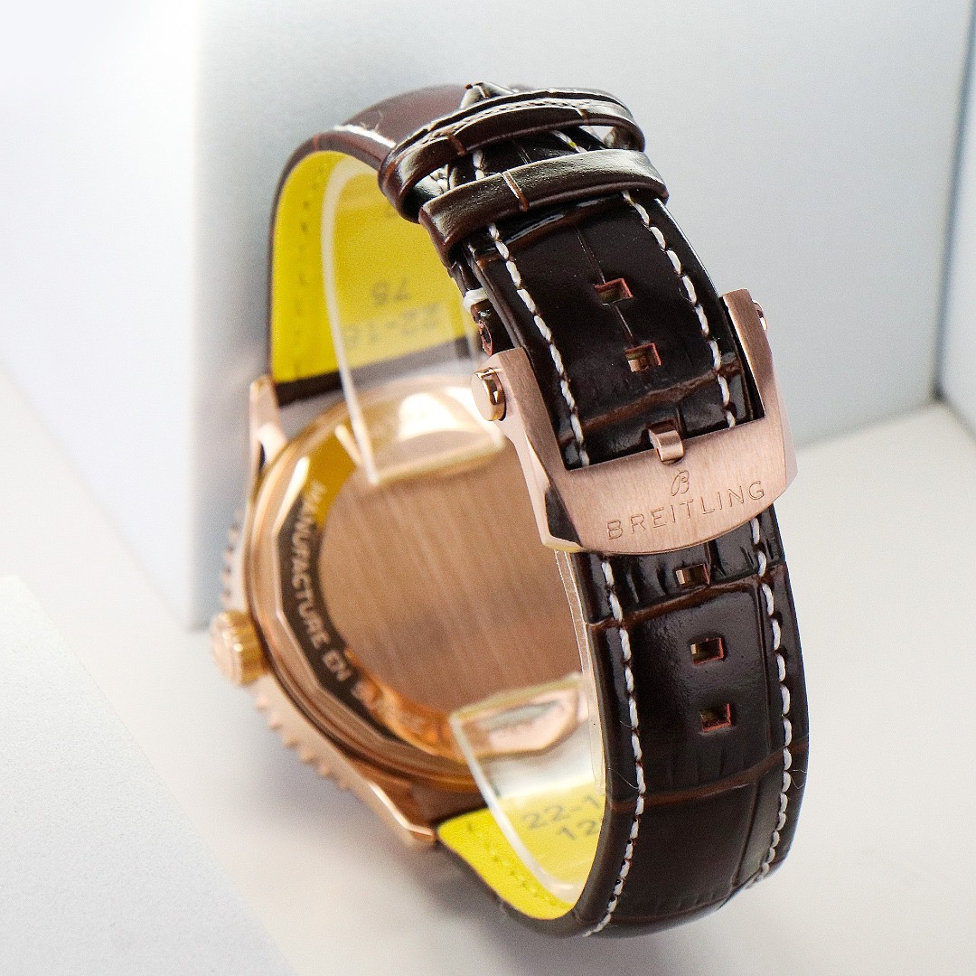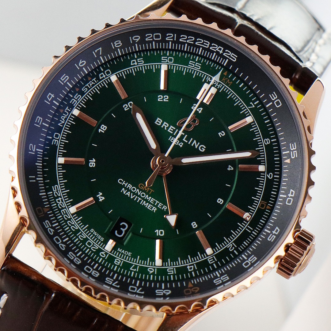Experience the timeless elegance and precision craftsmanship of the Breitling Navitimer Automatic GMT 41. This exquisite timepiece features a captivating green dial accented by index hour markers and a convenient date display. The 18k rose gold case adds a touch of luxury, complemented by the bidirectional rotating notched bezel for added functionality. The black leather strap with a rose gold tang buckle ensures a comfortable and secure fit. With automatic movement and chronometer accuracy, this watch is as reliable as it is stylish. Add a sophisticated touch to your ensemble with the Breitling Navitimer Automatic GMT 41.