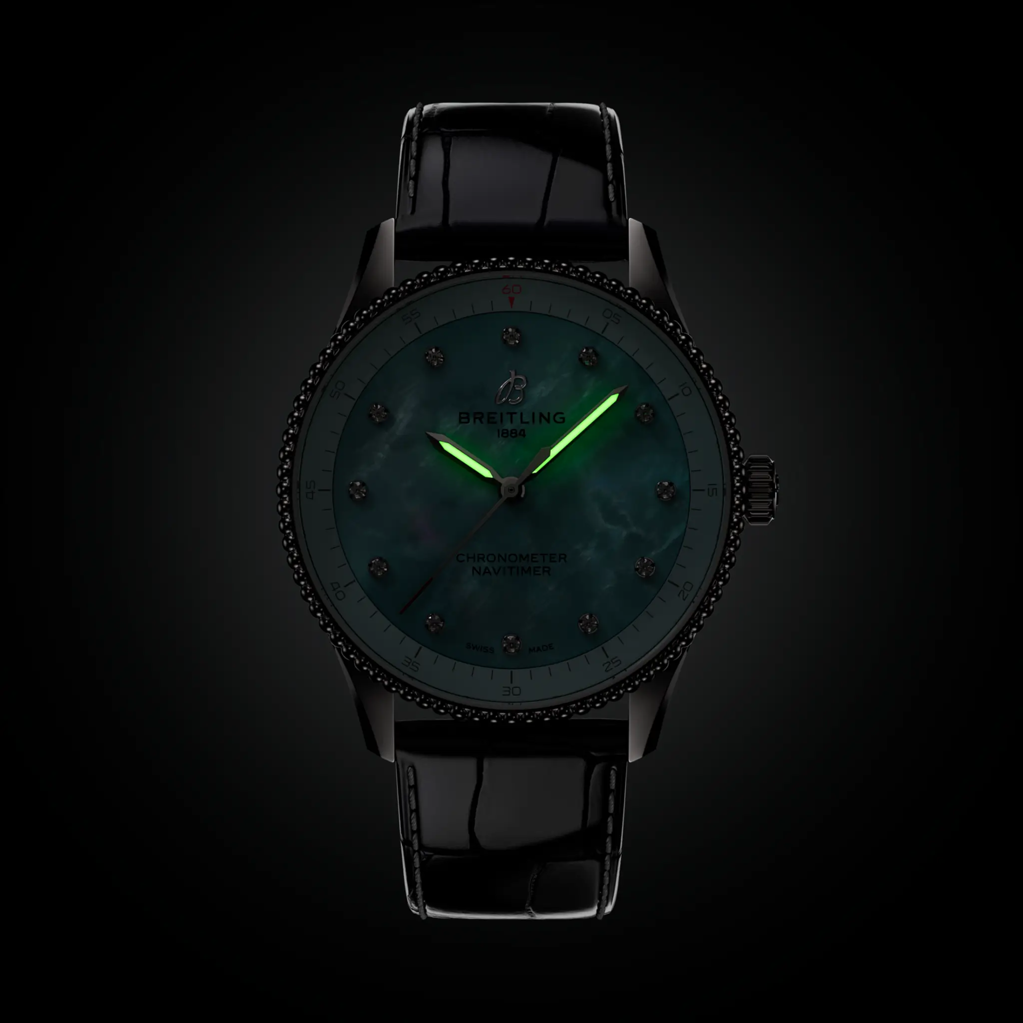 The 32mm stainless steel case is framed by an iconic Navitimer beaded bezel and is presented on a blue alligator leather strap.