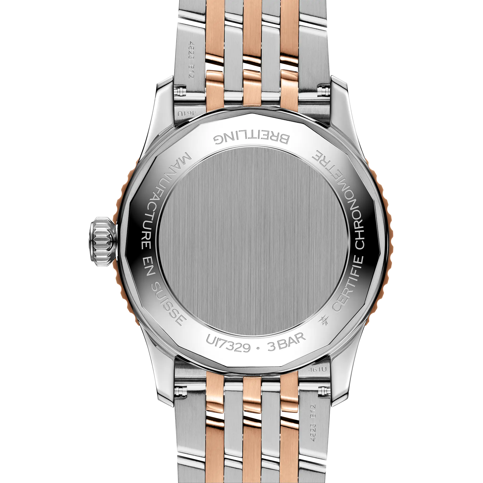 Experience timeless elegance with the Breitling Navitimer Automatic 41 U17329F41G1U1. This exquisite timepiece features a sleek silver dial accented by index hour markers and a slide rule for added functionality. The 41mm stainless steel case is complemented by an 18k rose gold notched bezel, combining luxury with durability. The steel bracelet with deployment buckle ensures a comfortable fit for everyday wear. Equipped with automatic movement and certified as a chronometer, this watch seamlessly blends style and precision. Elevate your look with the sophisticated charm of the Breitling Navitimer Automatic 41.