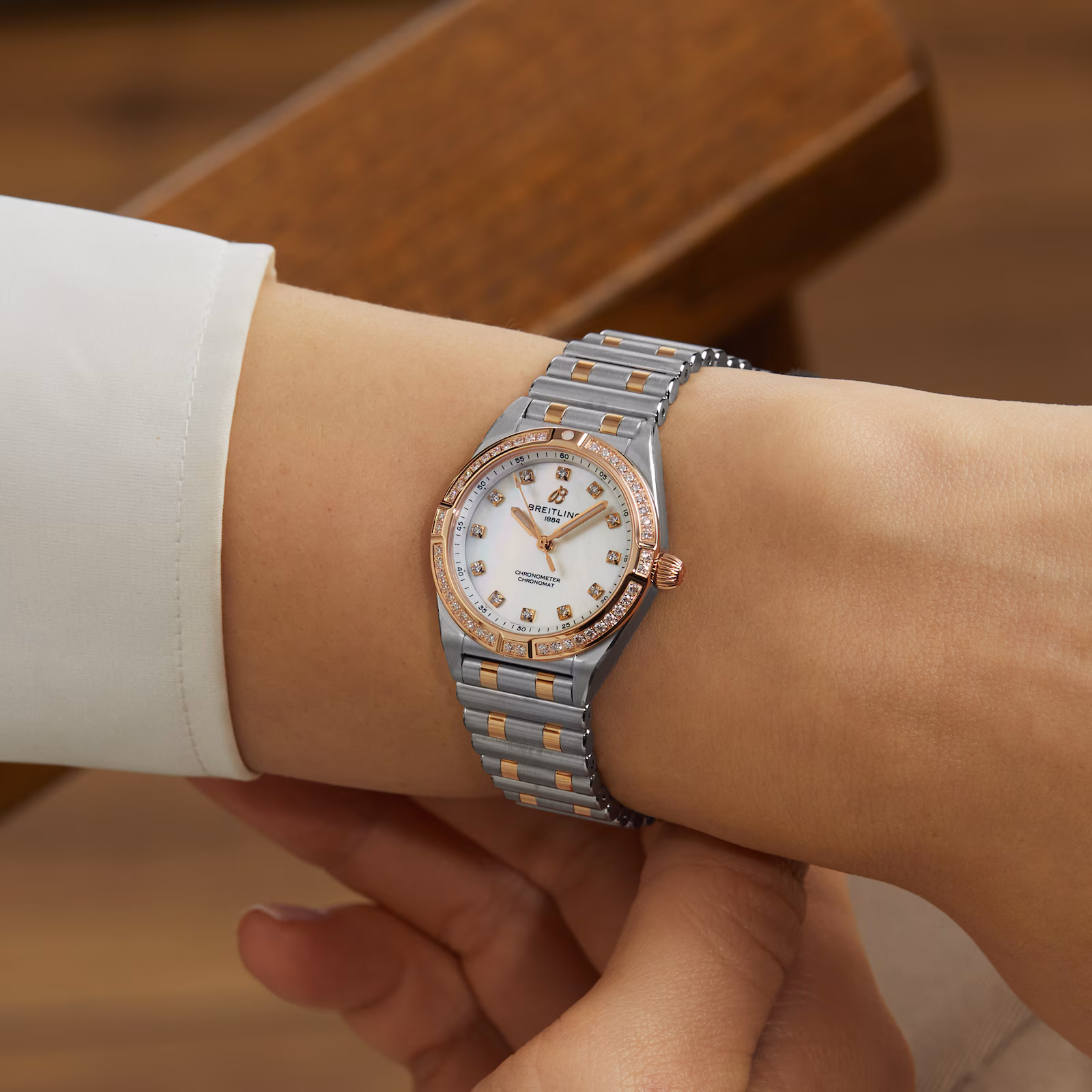 On trend, yet timeless, the petite Chronomat 28 is the versatile sports chic watch for any occasion. These showstoppers have so much more to offer than just their trim new sizes. Mother-of-pearl in various shades and traceable lab-grown diamonds combine with subtle refinements to give the timepieces a jewelry-like appeal. Choose your case and Rouleaux bracelet style: from straight-up stainless steel to mixed-metal duotone—all with a comfortable butterfly folding clasp. The Chronomat 28 is powered by the Breitling Caliber 72, a COSC-certified SuperQuartz™ chronometer.