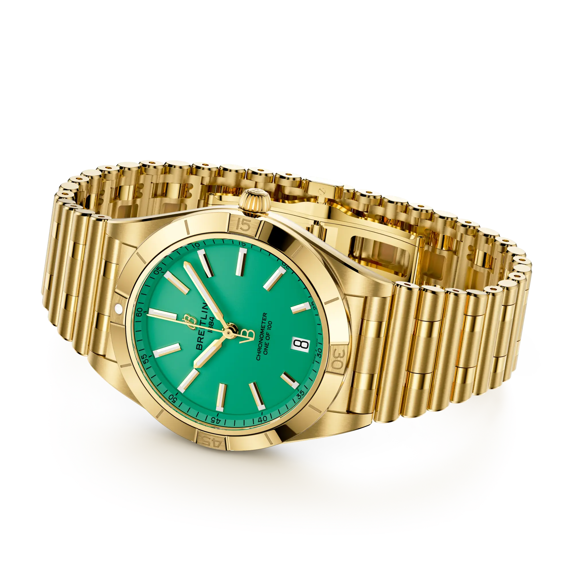 - Playful peppermint green dial beautifully complements the warm tones of the yellow gold