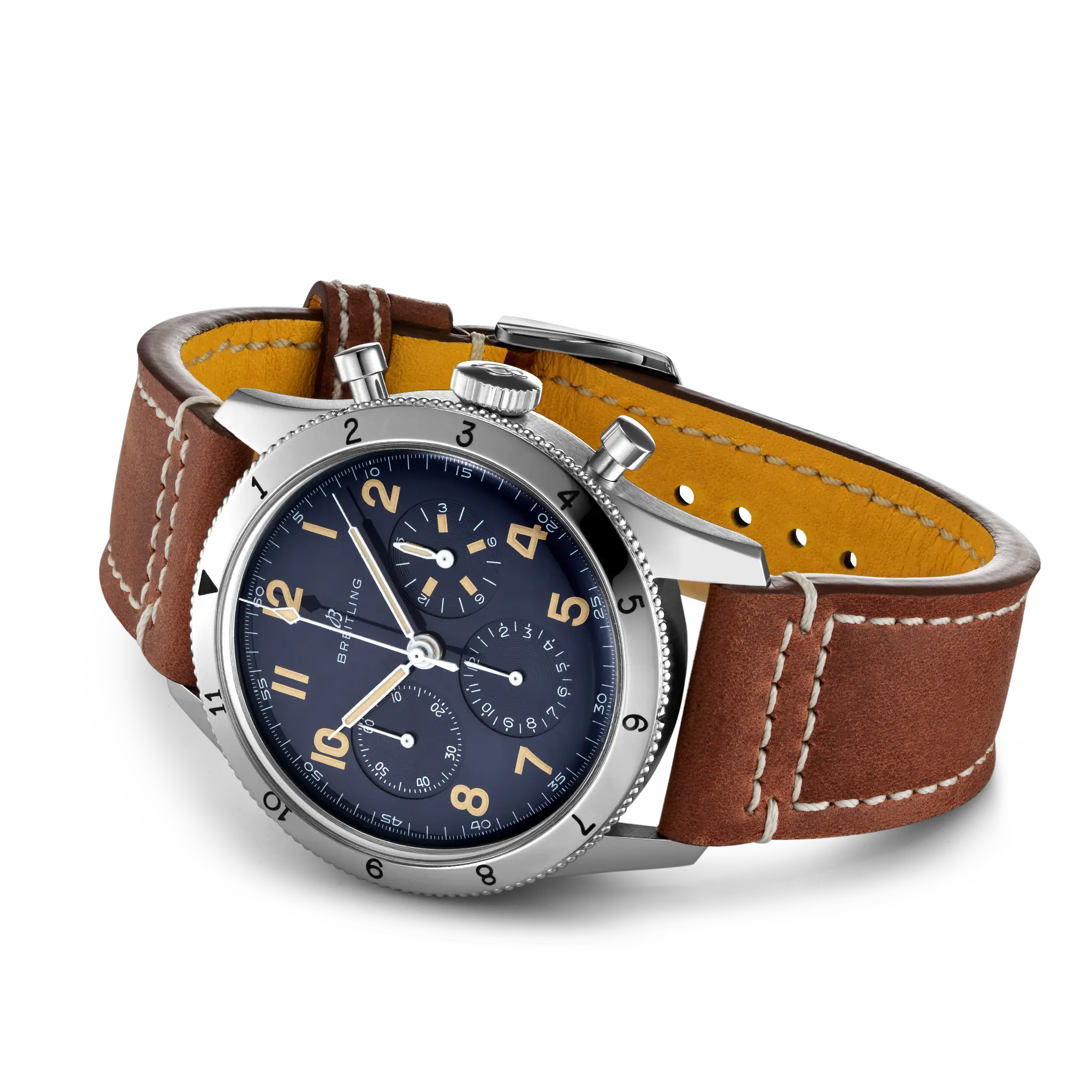 The platinum case and bezel of the Breitling Aviator 8 Avi 1953 Platinum Men's Watch LB0920131C1X1 have a polished finish, complemented by a vintage-style brown leather strap. On the black dial, you'll find Arabic numeral hour markers and a chronograph, inspired by the original Co-Pilot Ref. 765 AVI launched in 1953. This re-edition is a must-have for those passionate about aviation, radiating undeniable luxury.