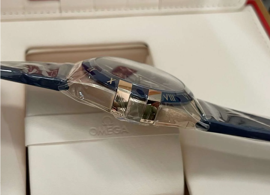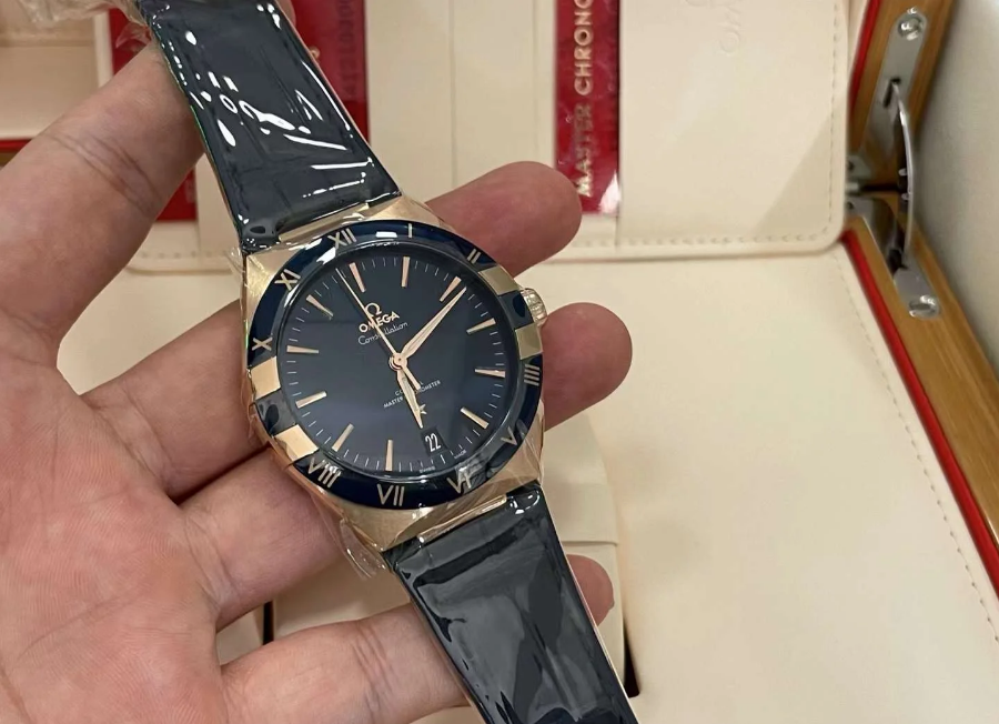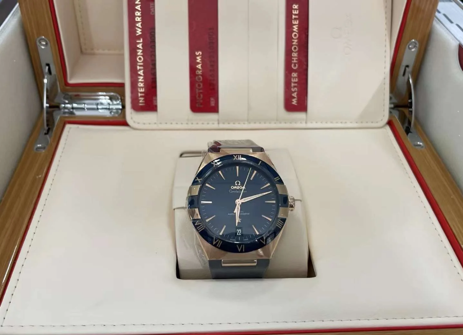 Unworn Omega Constellation CO‑AXIAL MASTER CHRONOMETER 131.63.41.21.03.001. 41 mm, Blue dial, Sedna™ Gold case, Blue ceramic bezel, 8901 calibre, Automatic Movement, 60 hours power reserve, Leather strap Foldover clasp. Water resistant to 50 m.