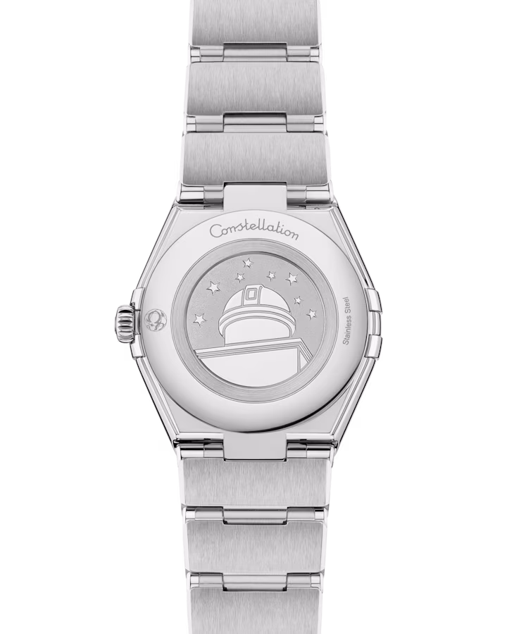 Calibre OMEGA 4061: Quartz movement with "Long Life" feature to maximize the autonomy of the battery. Exclusive red OMEGA logo with rhodium plated parts and circular graining.