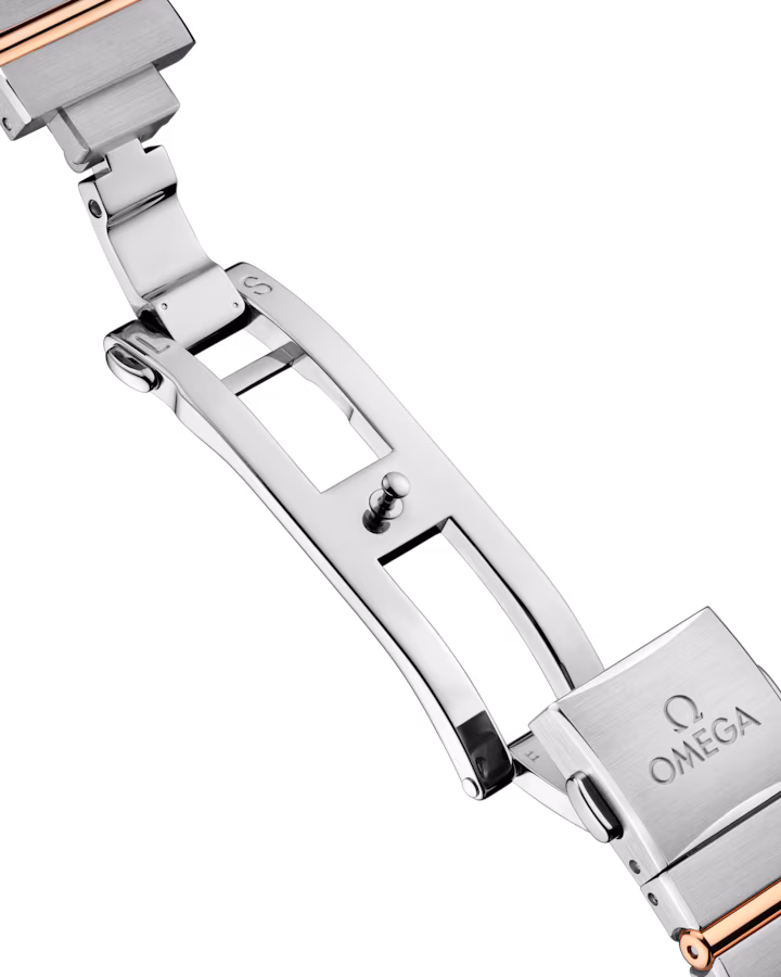 Calibre OMEGA 4061: Quartz movement with "Long Life" feature to maximize the autonomy of the battery. Exclusive red OMEGA logo with rhodium plated parts and circular graining.