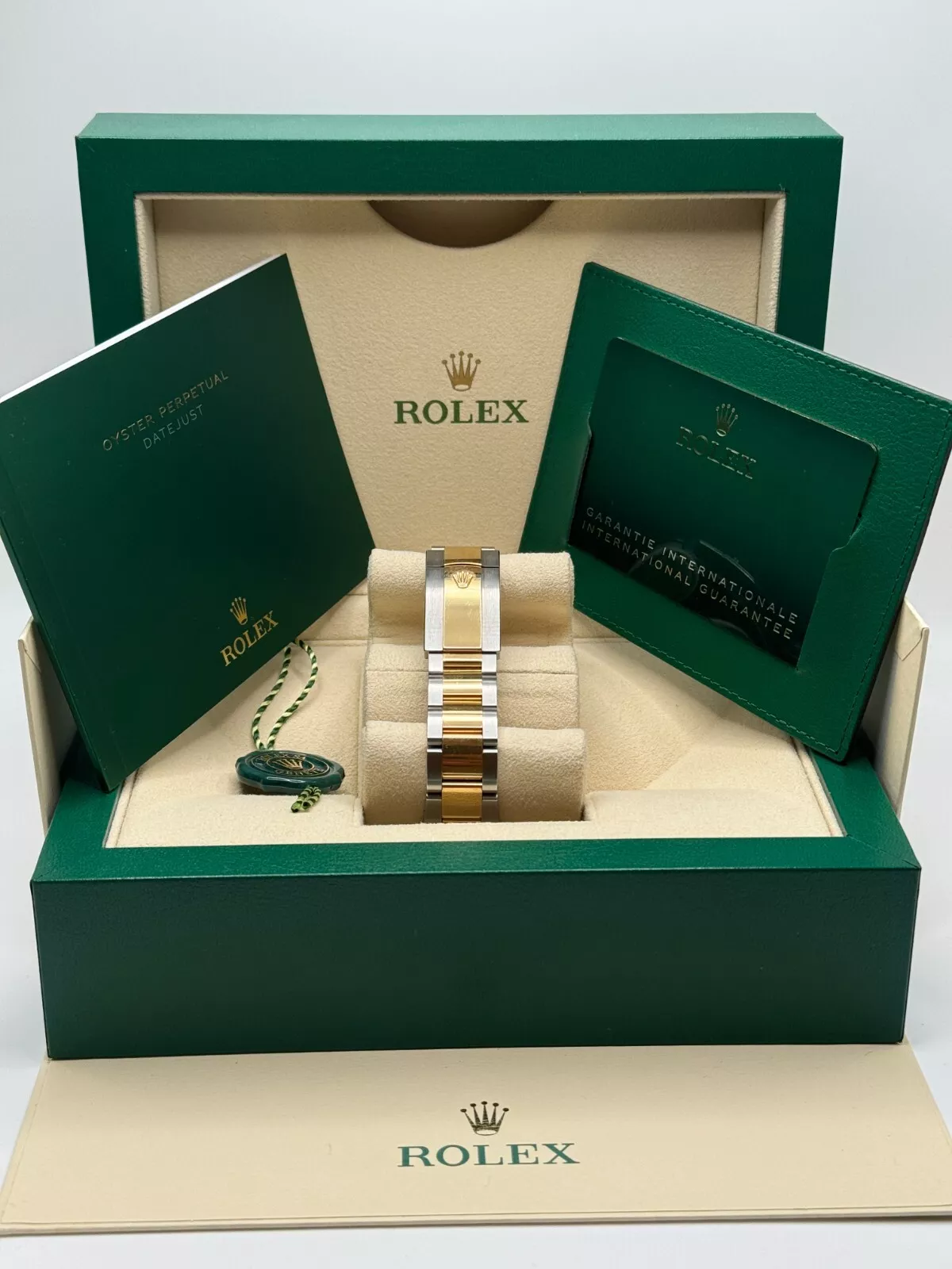 41mm Yellow Rolesor case with 904L steel monobloc middle case, screw-down steel back, 18K yellow gold screw-down crown, 18K yellow gold fluted bezel, scratch-resistant double anti-reflective sapphire crystal with cyclops lens over the date, champagne dial, index hour markers, Rolex caliber 3235 perpetual self-winding movement with date at 3 o'clock that changes instantaneously at midnight in a few thousandths of a second, approximately 70 hours of power reserve, yellow Rolesor Jubilee bracelet made from a combination of 904L steel and 18K yellow gold with five-piece links, folding Oysterclasp buckle with Easylink 5mm comfort extension link. Waterproof to 100 meters.