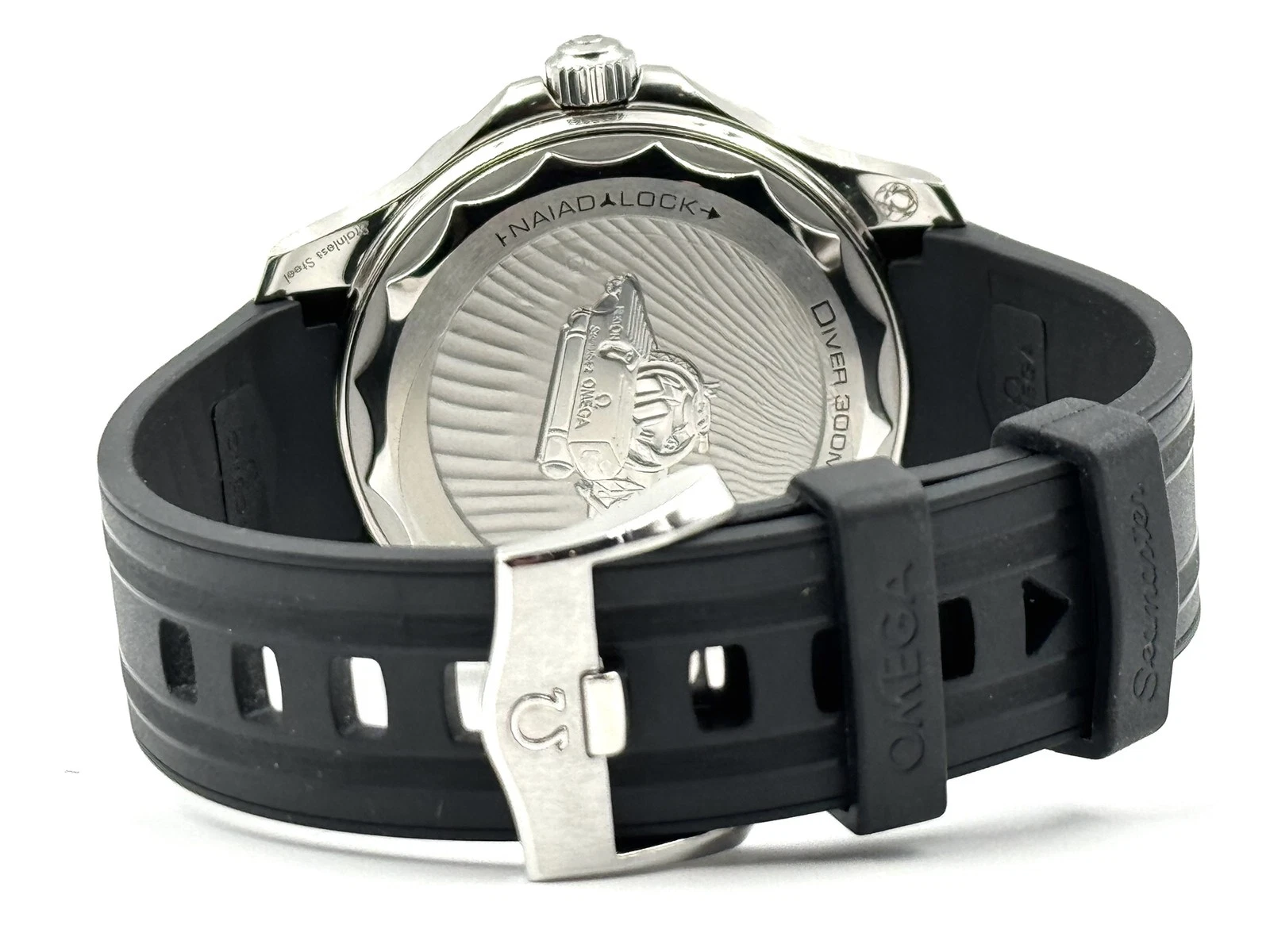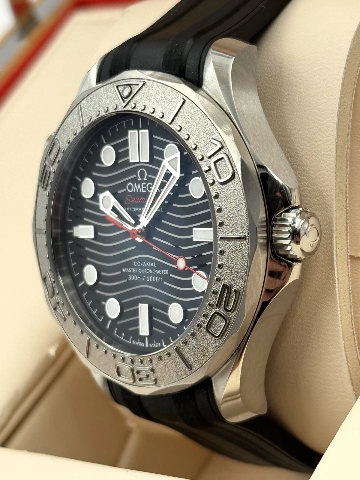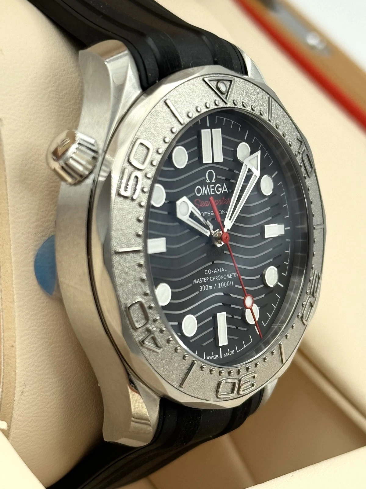 Unworn Omega Seamaster DIVER 300M CO‑AXIAL MASTER CHRONOMETER 210.32.42.20.01.002. 42 mm, Black dial, Steel case, Ceramic bezel, 8806 calibre, Self Winding Movement, 55 hours power reserve, Rubber strap with Pin buckle clasp. Water resistant to 300 m.