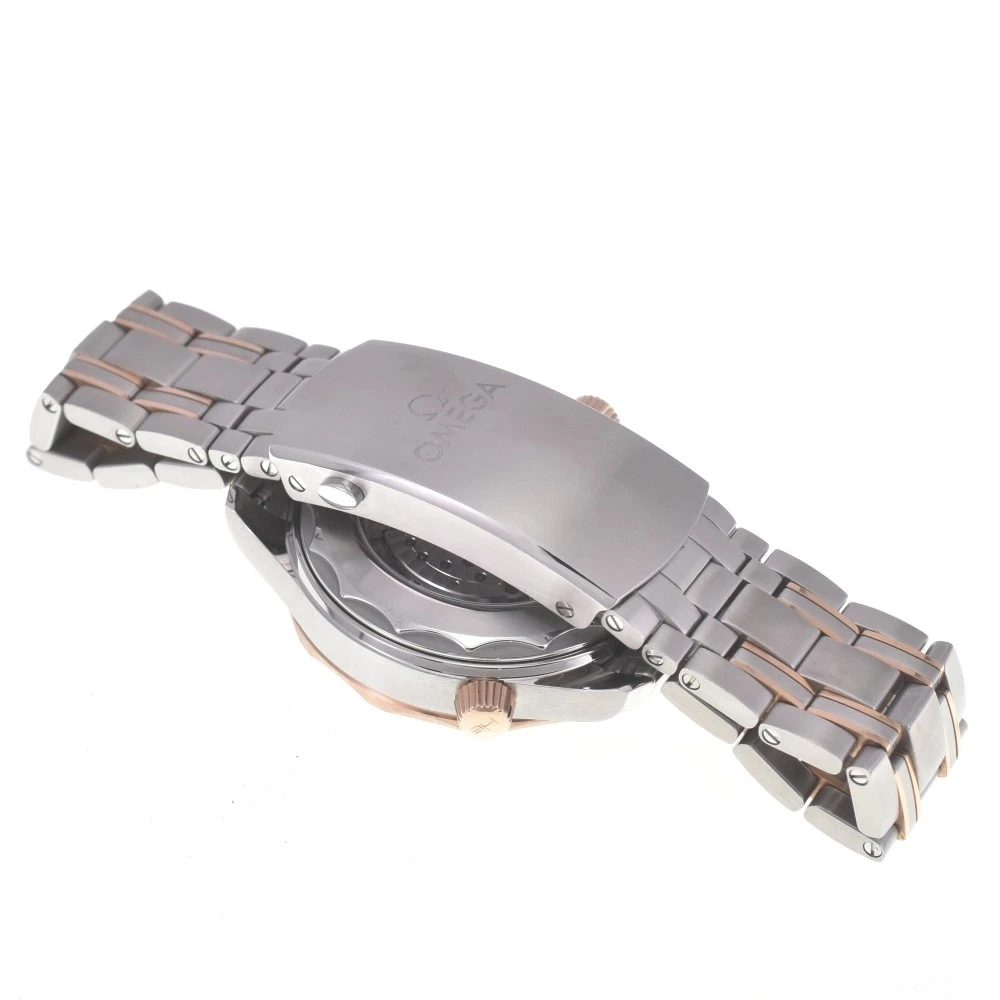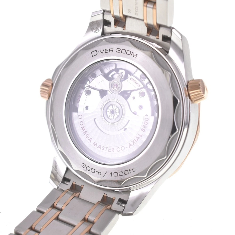 The Omega Seamaster Men's Watch 210.20.42.20.01.001 is a self-winding, automatic master chronometer. Its round brushed case, made of polished stainless steel, is paired with a brushed stainless steel and 18k rose gold bracelet. The black ceramic dial features a laser-engraved wave pattern and is adorned with luminescent index and dot hour markers, as well as skeleton hands. The unidirectional rotating black ceramic bezel displays an 18k rose gold diving scale. At 6 o'clock, there is a date feature. Inside, the watch is powered by the Omega caliber 8800 self-winding automatic master chronometer movement with co-axial escapement and an anti-magnetic feature, providing a 55 hour power reserve. With 25,200 vibrations per hour and 35 jewels, this watch is precise and reliable.