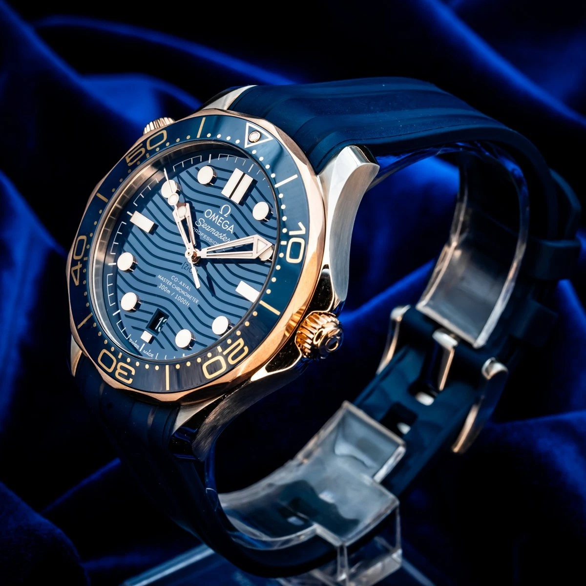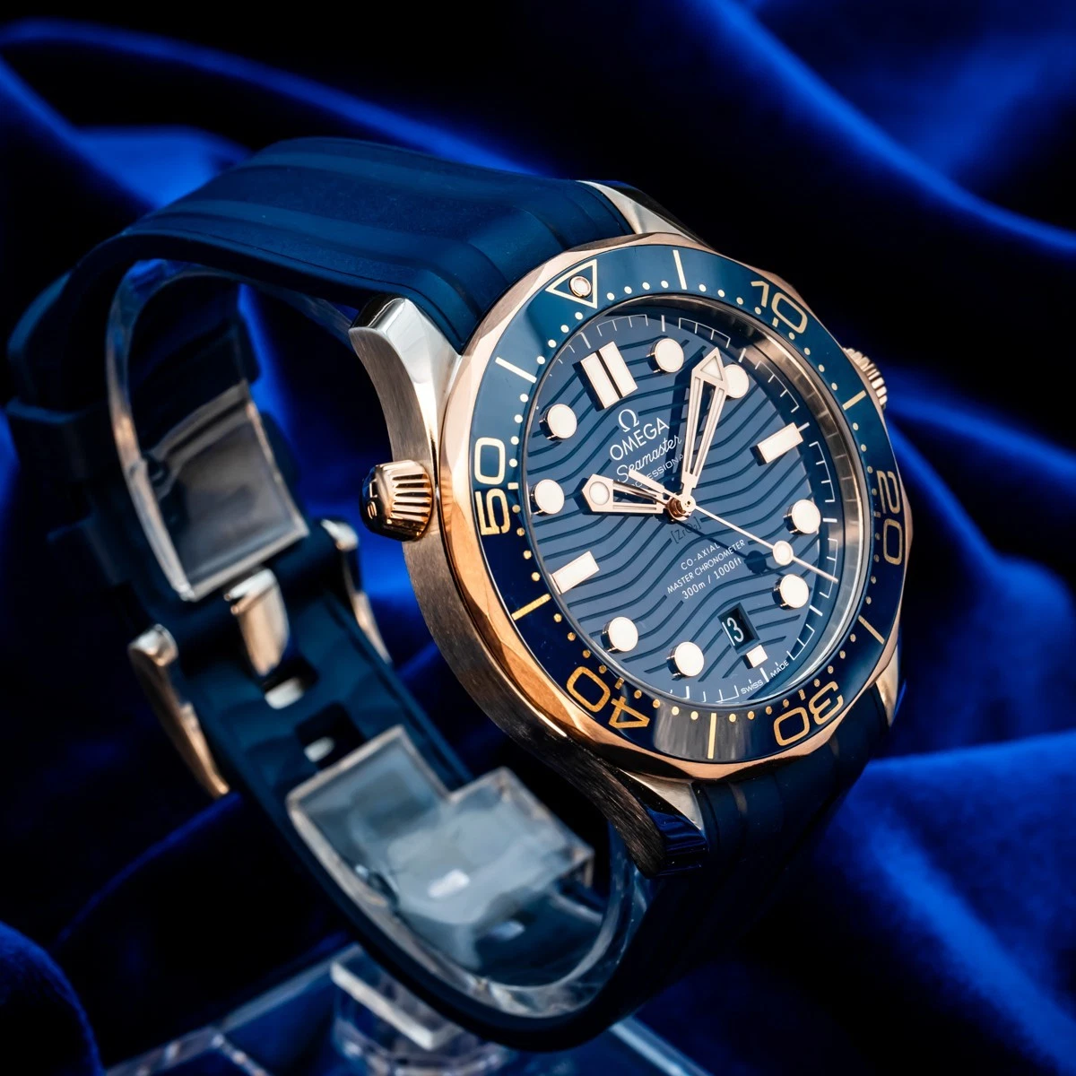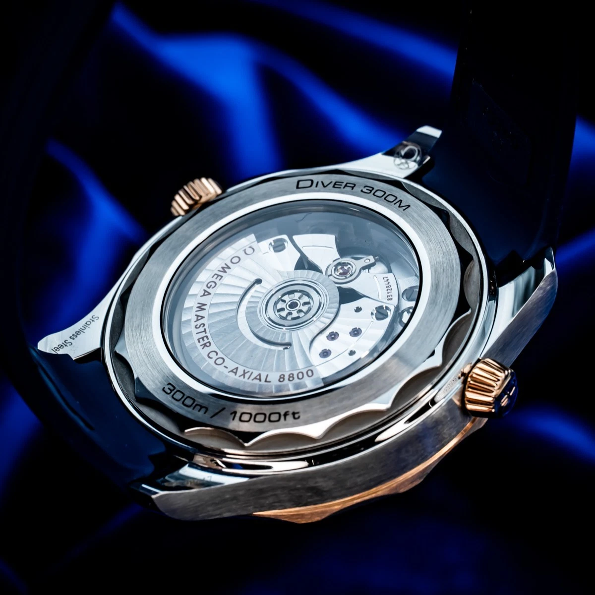 The watch is presented on a blue rubber strap and is driven by the OMEGA Master Chronometer Calibre 9900, which can be seen through the sapphire-crystal on the wave-edged caseback.