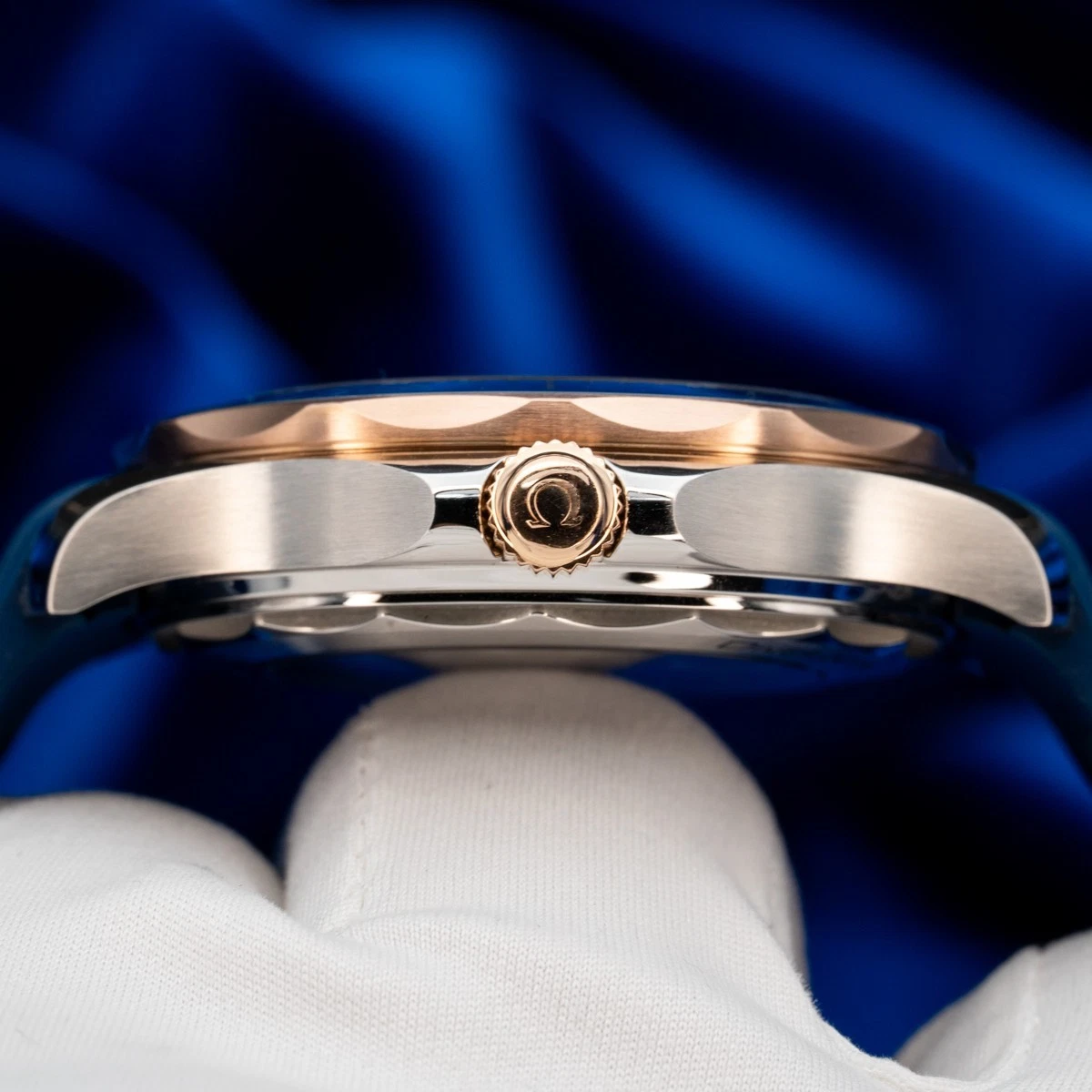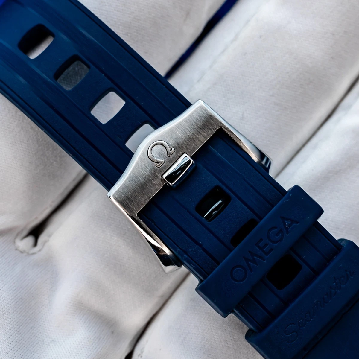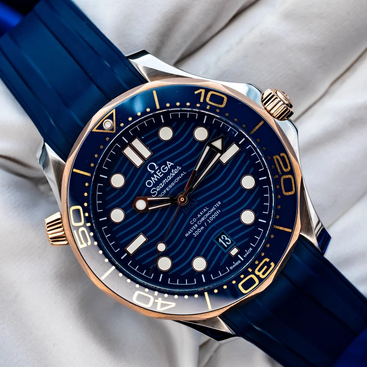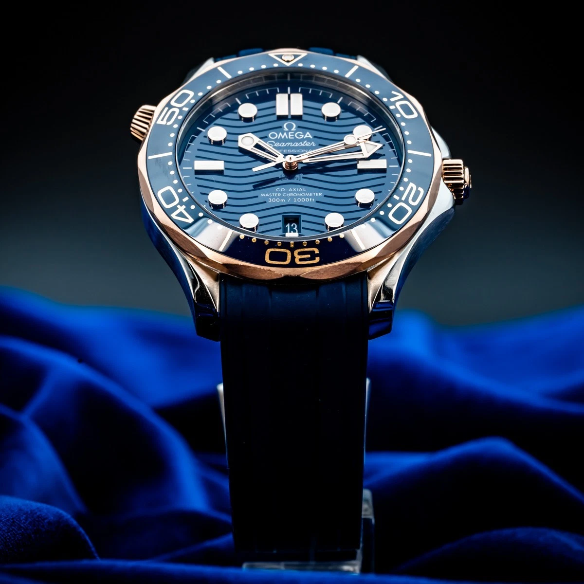 The watch is presented on a blue rubber strap and is driven by the OMEGA Master Chronometer Calibre 9900, which can be seen through the sapphire-crystal on the wave-edged caseback.