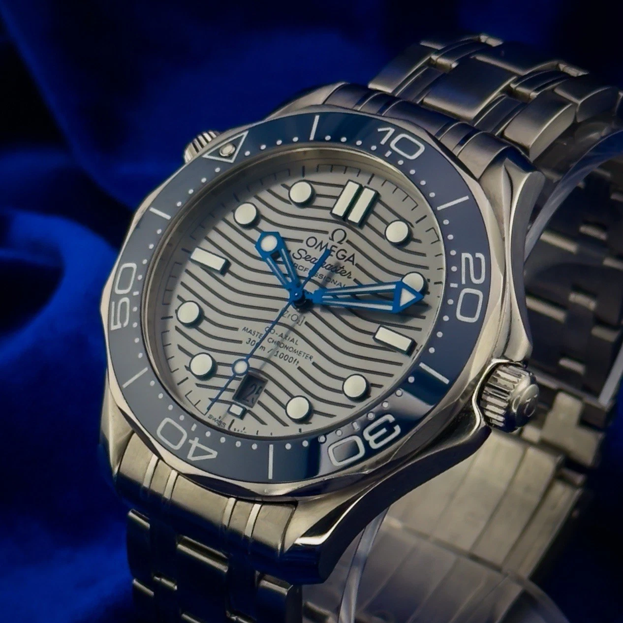 The Omega Seamaster Diver 300M Stainless Steel Men's Watch 210.30.42.20.06.001 features a brushed and polished stainless steel case and bracelet, showcasing a blue ceramic bezel with a white enamel diving scale. The sun-brushed ceramic grey dial with wave pattern is accented by Super-LumiNova filled luminescent hands and hour markers. A date window is located at 6 o'clock, and the watch is equipped with an anti-magnetic feature that can resist magnetic fields greater than 1.5 tesla (15,000 gauss). The watch also includes a helium escape valve with a conical design at 10 o'clock and is powered by the Omega Calibre 8800 self-winding automatic COSC Chronometer certified movement with a 55-hour power reserve and co-axial escapement.