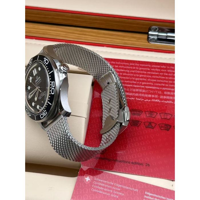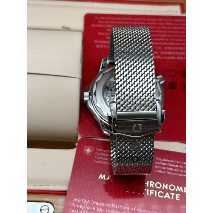 A brushed stainless steel mesh bracelet with a secure clasp enhances both durability and style. At the heart of this masterpiece is the OMEGA Co-Axial Master Chronometer Caliber 8806, visible through a sapphire crystal caseback. This movement not only ensures precision but is also certified to resist magnetic fields and perform flawlessly in challenging environments.