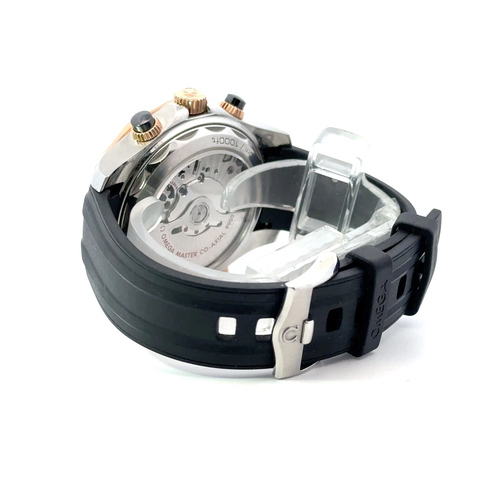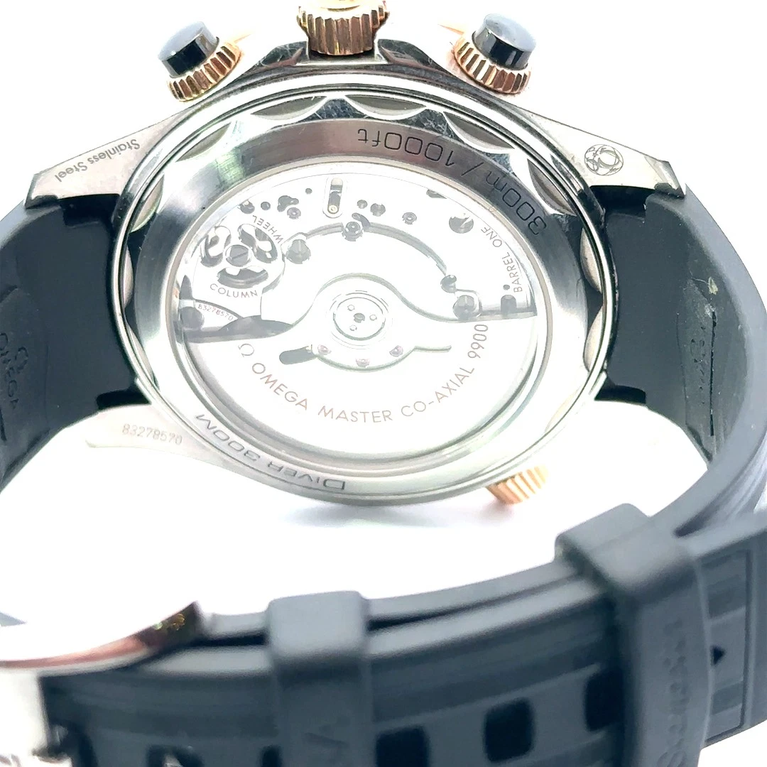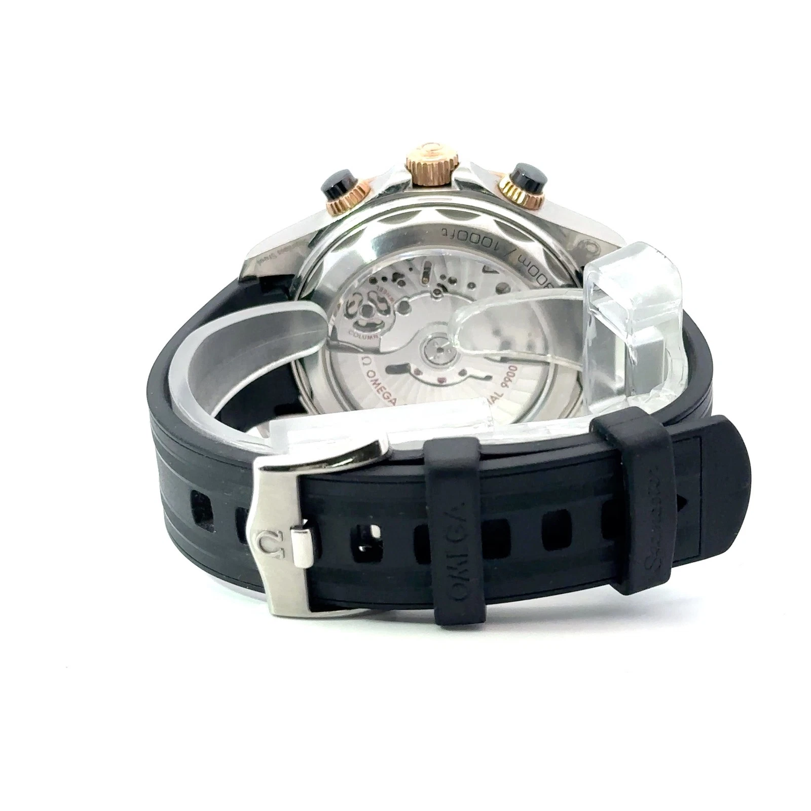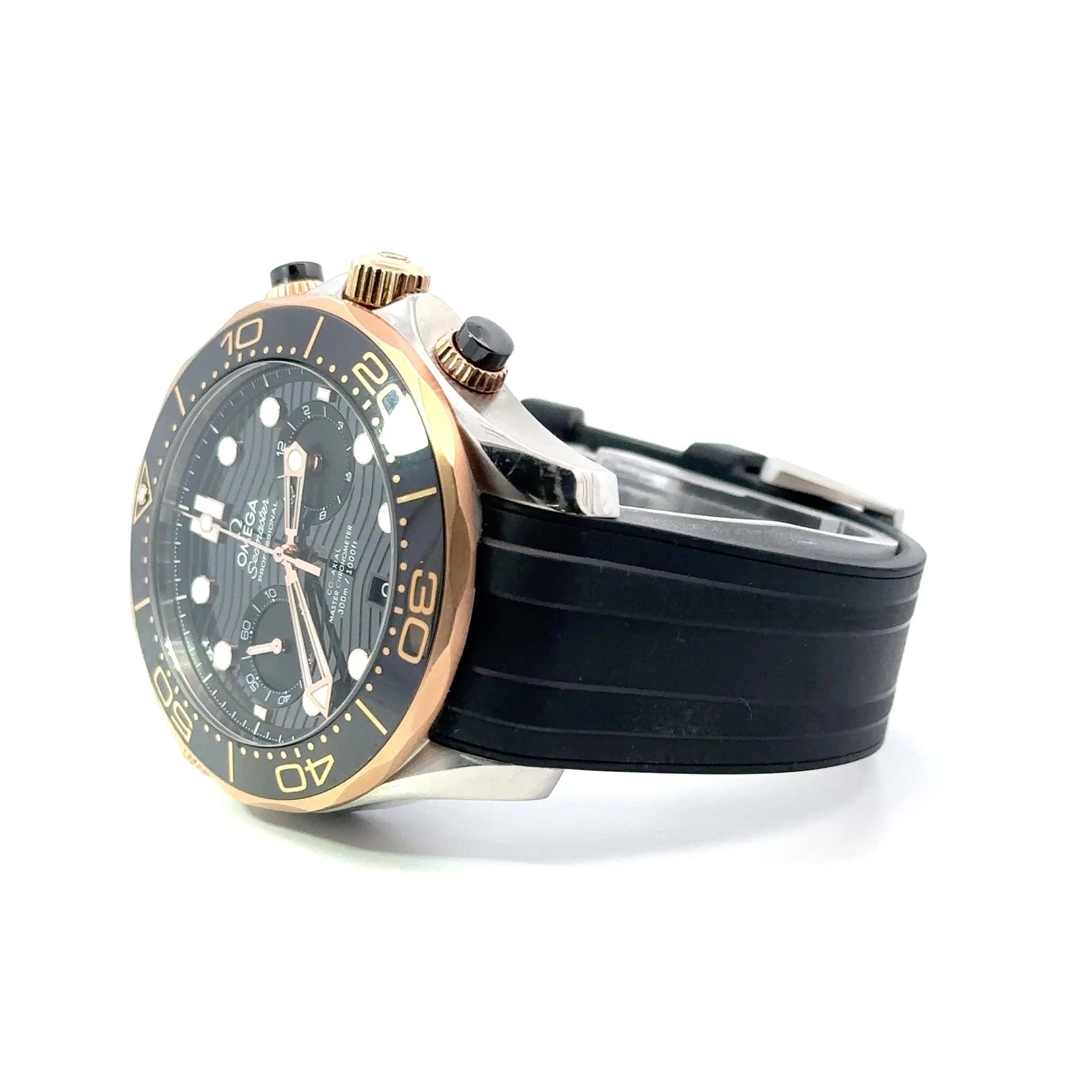 Since 1993, the Seamaster Professional Diver 300M has enjoyed a legendary following. Today’s modern collection has embraced that famous ocean heritage and updated it with OMEGA’s best innovation and design.This 44 mm chronograph model is crafted from stainless steel and 18K Sedna™ gold, and includes a polished black ceramic bezel with a Ceragold™ diving scale. The pushers are also polished black ceramic, as well as the dial which features laser-engraved waves and a date window at 6 o’clock.The subdial hands are 18K Sedna™ gold, along with all other hands and indexes which are filled with white Super-LumiNova.The watch is presented on a black rubber strap and is driven by the OMEGA Master Chronometer Calibre 9900, which can be seen through the sapphire-crystal on the wave-edged caseback.