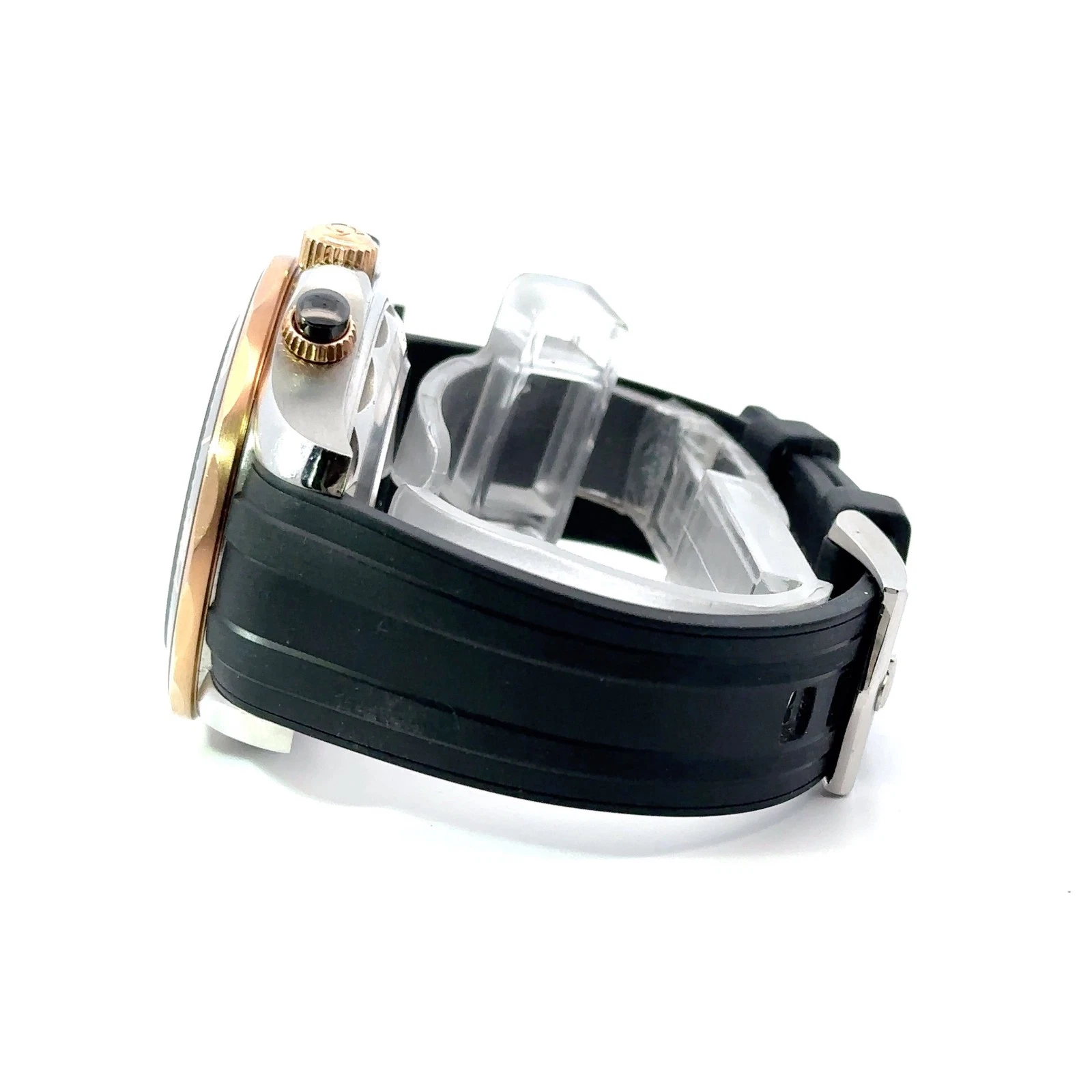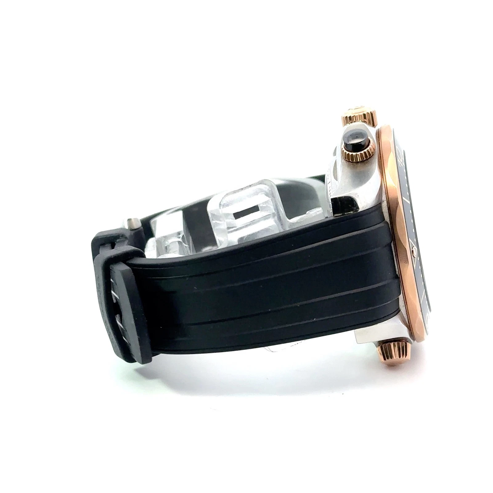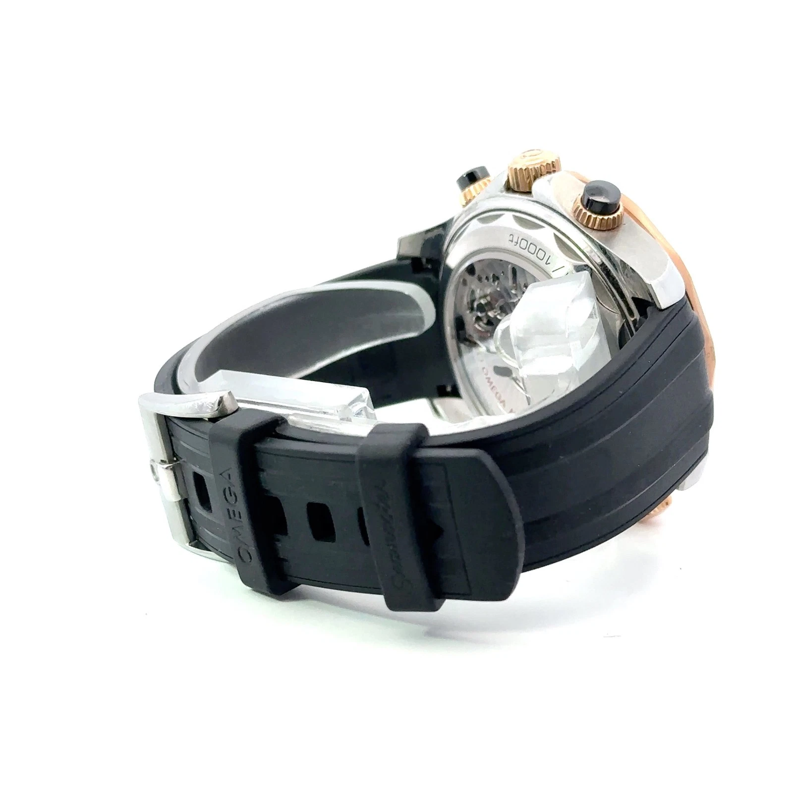Since 1993, the Seamaster Professional Diver 300M has enjoyed a legendary following. Today’s modern collection has embraced that famous ocean heritage and updated it with OMEGA’s best innovation and design.This 44 mm chronograph model is crafted from stainless steel and 18K Sedna™ gold, and includes a polished black ceramic bezel with a Ceragold™ diving scale. The pushers are also polished black ceramic, as well as the dial which features laser-engraved waves and a date window at 6 o’clock.The subdial hands are 18K Sedna™ gold, along with all other hands and indexes which are filled with white Super-LumiNova.The watch is presented on a black rubber strap and is driven by the OMEGA Master Chronometer Calibre 9900, which can be seen through the sapphire-crystal on the wave-edged caseback.