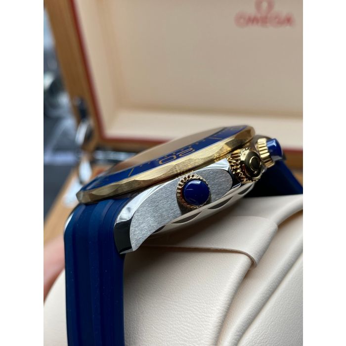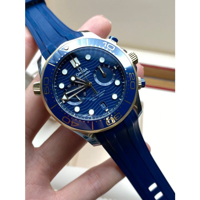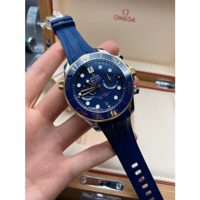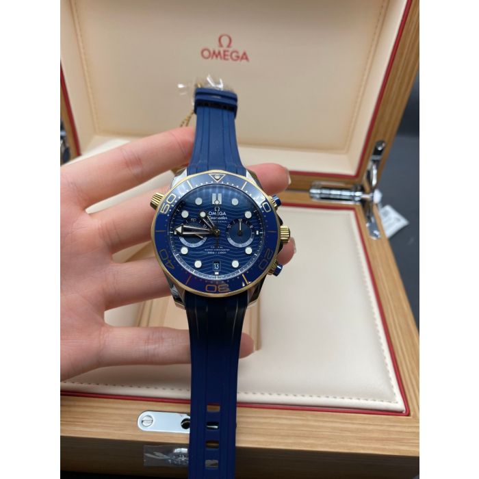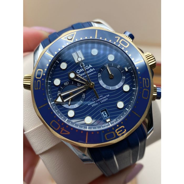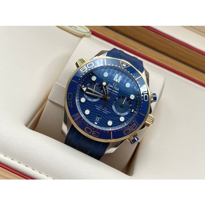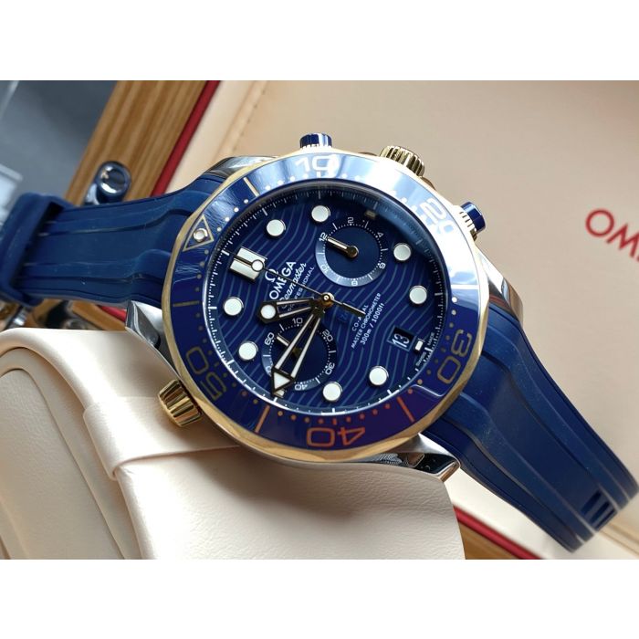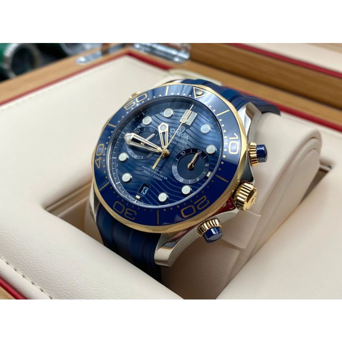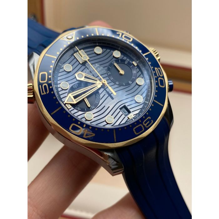 Since 1993, the Seamaster Professional Diver 300M has enjoyed a legendary following. Today’s modern collection has embraced that famous ocean heritage and updated it with OMEGA’s best innovation and design.This 44 mm chronograph model is crafted from stainless steel and 18K yellow gold, and includes a polished blue ceramic bezel with a Ceragold™ diving scale. The pushers are also polished blue ceramic, as well as the dial which features laser-engraved waves and a date window at 6 o’clock.The subdial hands are 18K yellow gold, along with all other hands and indexes which are filled with white Super-LumiNova.The watch is presented on a blue rubber strap and is driven by the OMEGA Master Chronometer Calibre 9900, which can be seen through the sapphire-crystal on the wave-edged caseback.
