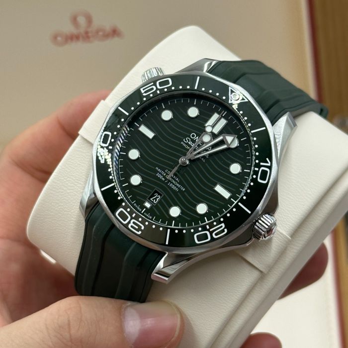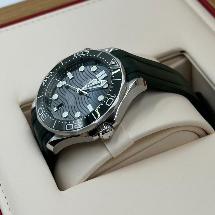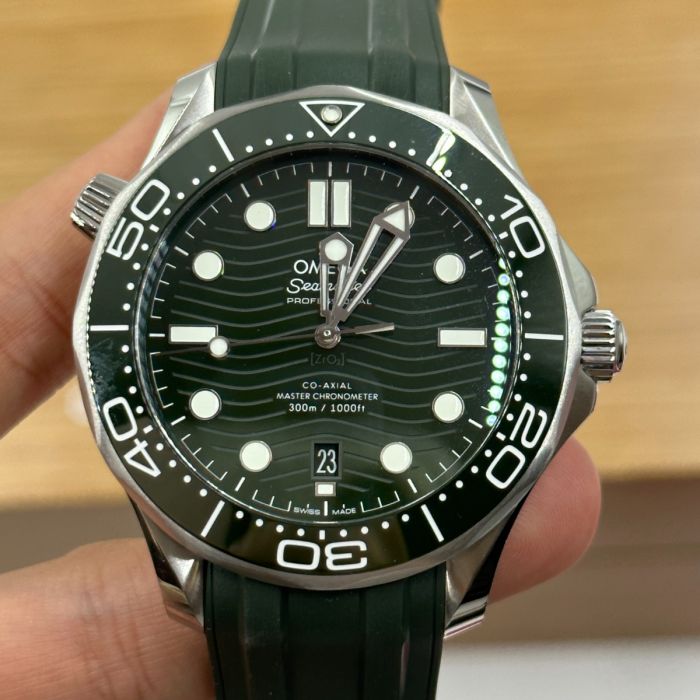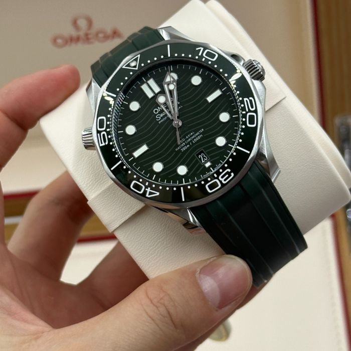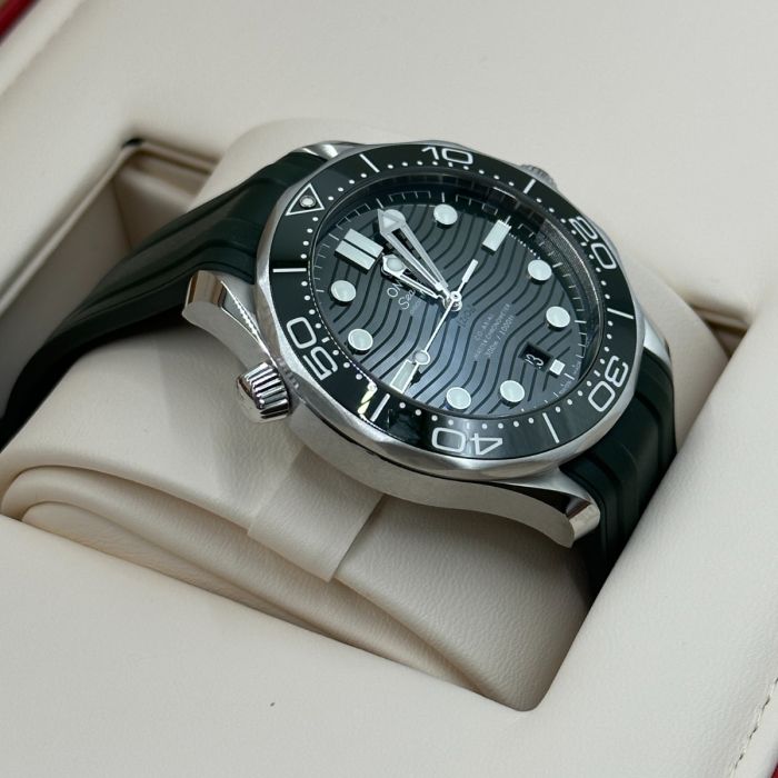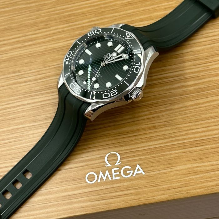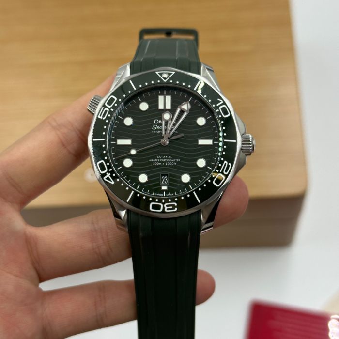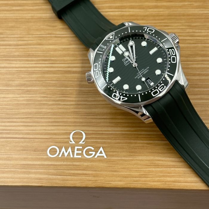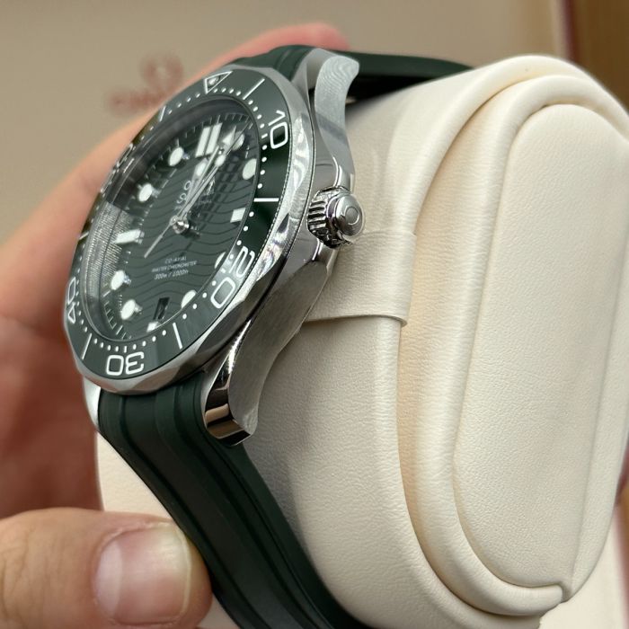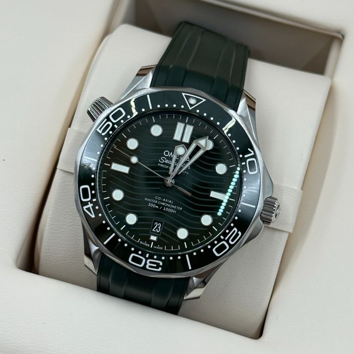 Unworn Omega Seamaster Diver 300M CO‑AXIAL MASTER CHRONOMETER 210.32.42.20.10.001. 42 mm, Green dial, Steel case, Ceramic bezel, OMEGA 8800 calibre, Self-winding Movement, 55 hours power reserve, Rubber strap with Pin buckle clasp. Water resistant to 300 m.