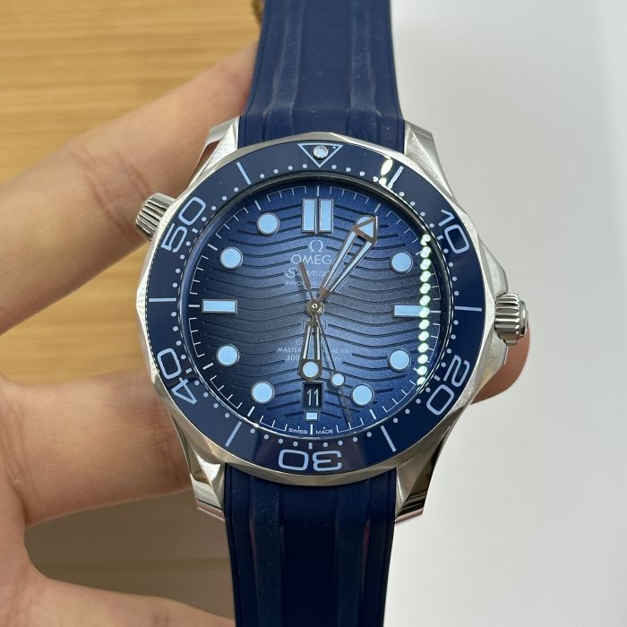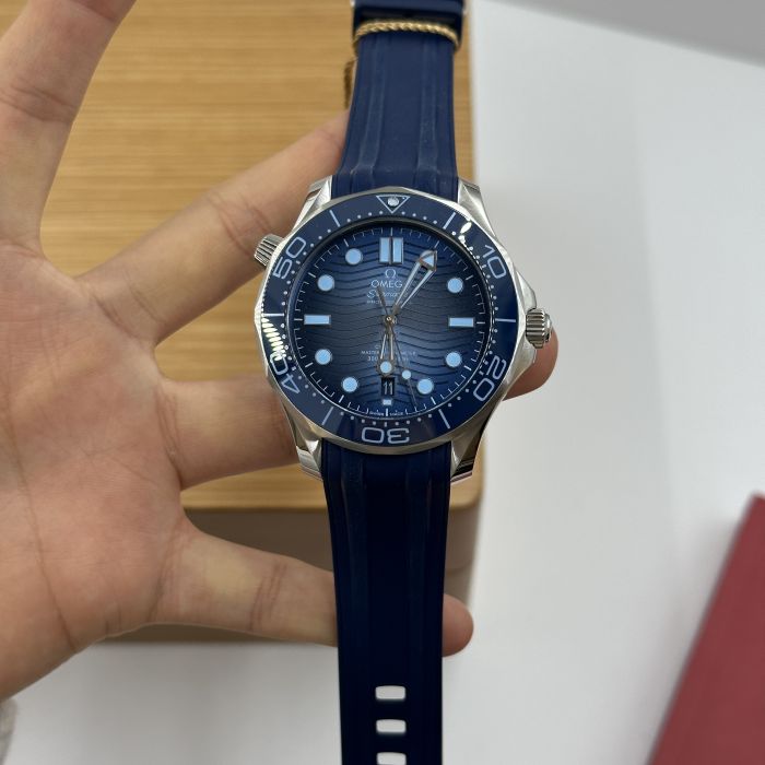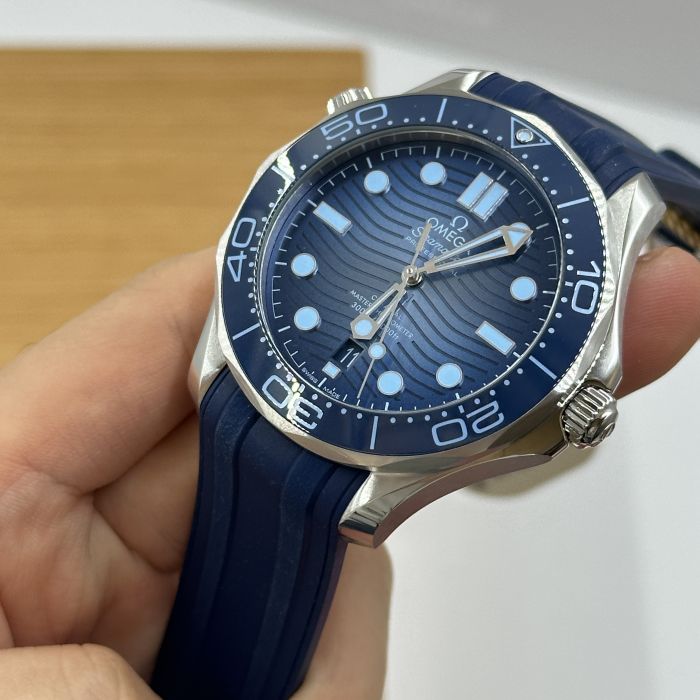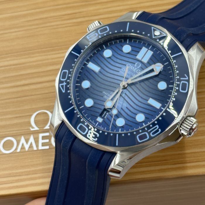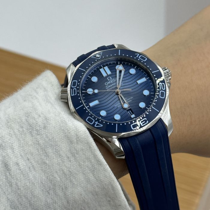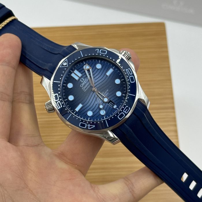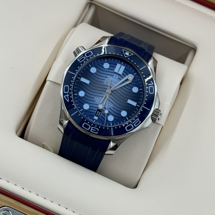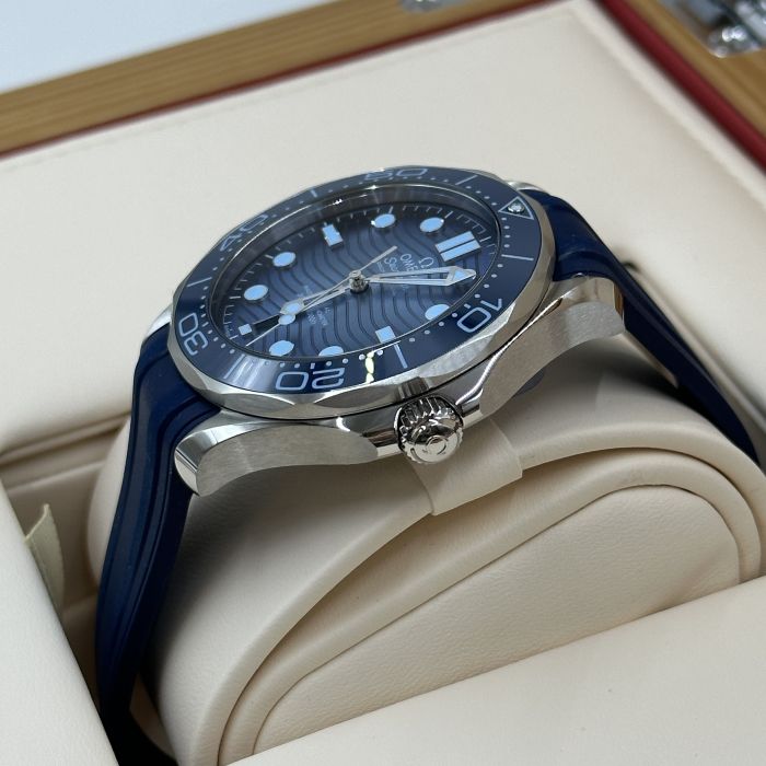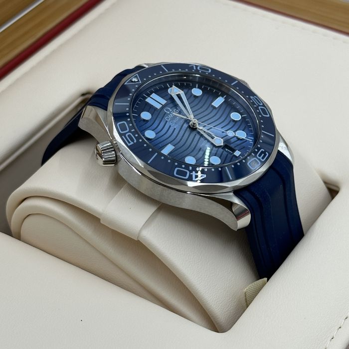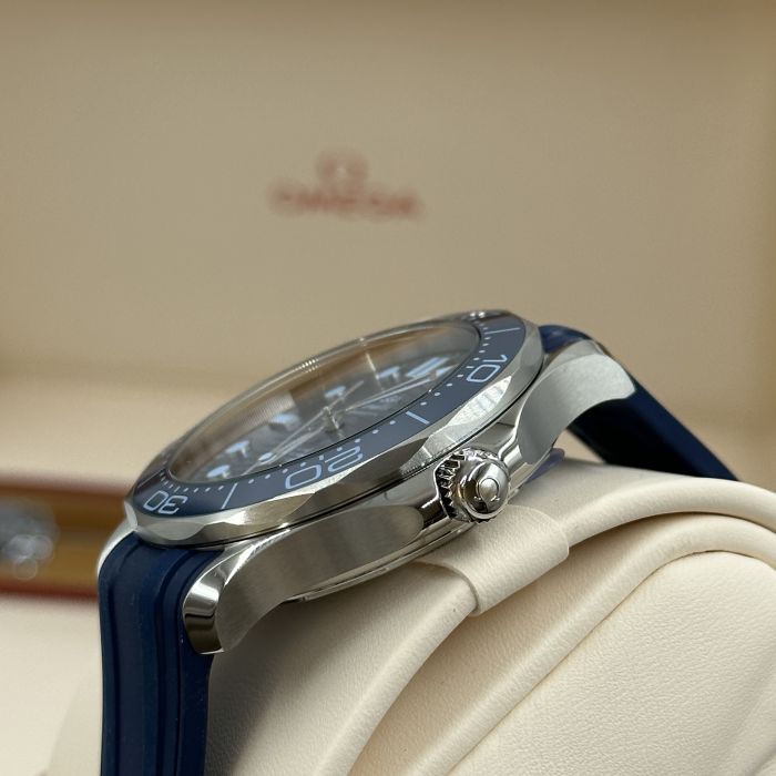 This 42 mm Seamaster Diver 300M, with its case in stainless steel, has a blue rubber strap. The ceramic dial, in OMEGA’s own Summer Blue, is PVD-treated and has a gradient finish to reflect the watch’s level of water resistance. It also includes the 300M’s famous wave pattern.