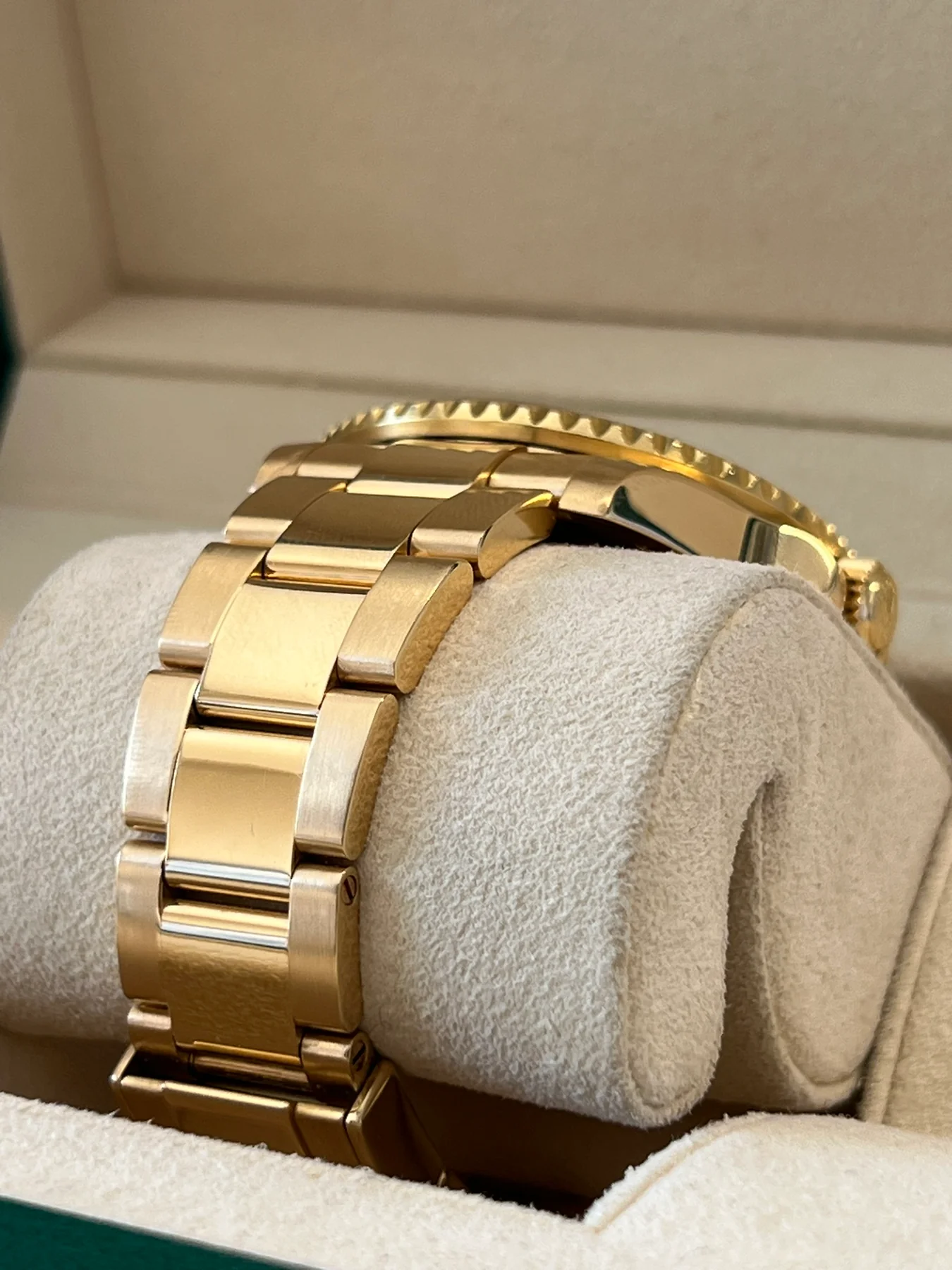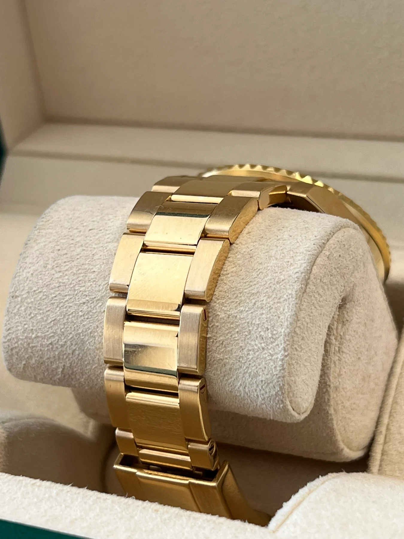 The beautiful Rolex 116718GSO watch features a 18kt yellow gold 40mm case, with a bi-directional rotating 18kt yellow gold bezel, and a green dial covered by a scratch resistant sapphire crystal. The stylish wristwatch is equipped with an exclusive 18kt yellow gold rolex oyster which combines comfort and sturdiness. This horological trendy device has GMT, second time zone, date, hour, minute, second, chronometer functions.