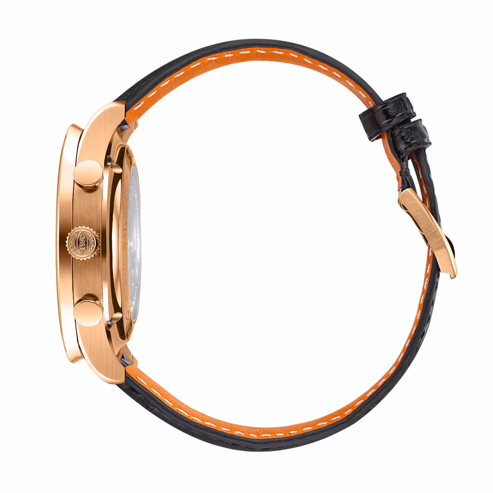 - Housed in a 41mm 18K rose gold case secured with a black alligator leather strap