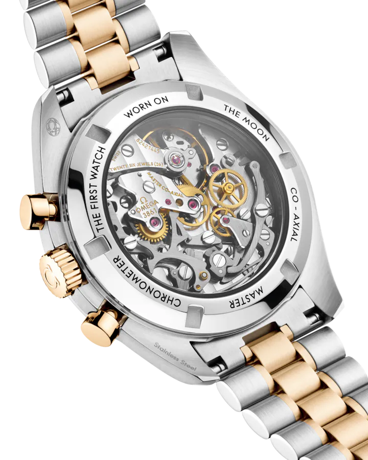 The Omega Speedmaster Moonwatch Professional, a symbol of OMEGA’s pioneering spirit, has been worn by astronauts on all six moon landings. This 42 mm model features stainless steel and 18K Moonshine Gold, with sapphire crystal on the front and caseback. Inspired by the 4th generation Speedmaster, it has an asymmetrical case, a black ceramic bezel ring with a tachymeter scale, and the famous "dot over ninety" in OMEGA Ceragold.