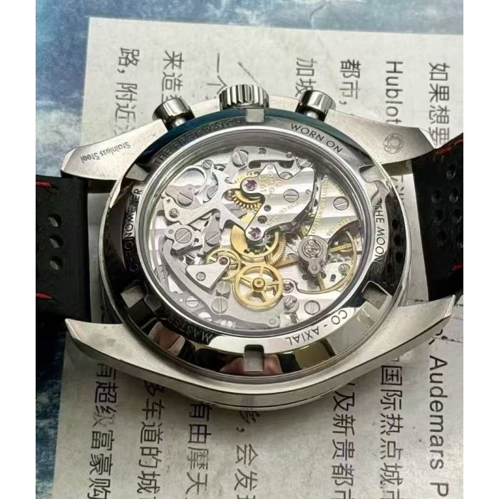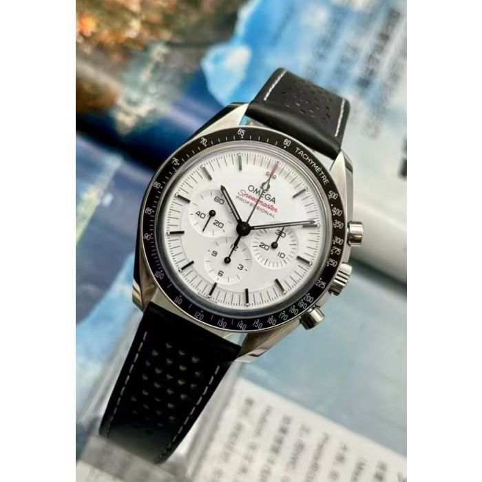 The watch is completed by a black micro-perforated leather strap with subtle red and white stitching, adding a modern, sporty edge. With its superior anti-magnetic protection, water resistance to 50 meters, and a 5-year warranty, this Moonwatch is as robust as it is refined. Whether you're drawn to its lunar legacy or cutting-edge performance, the Speedmaster Moonwatch remains one of the most iconic and collectible chronographs ever made.