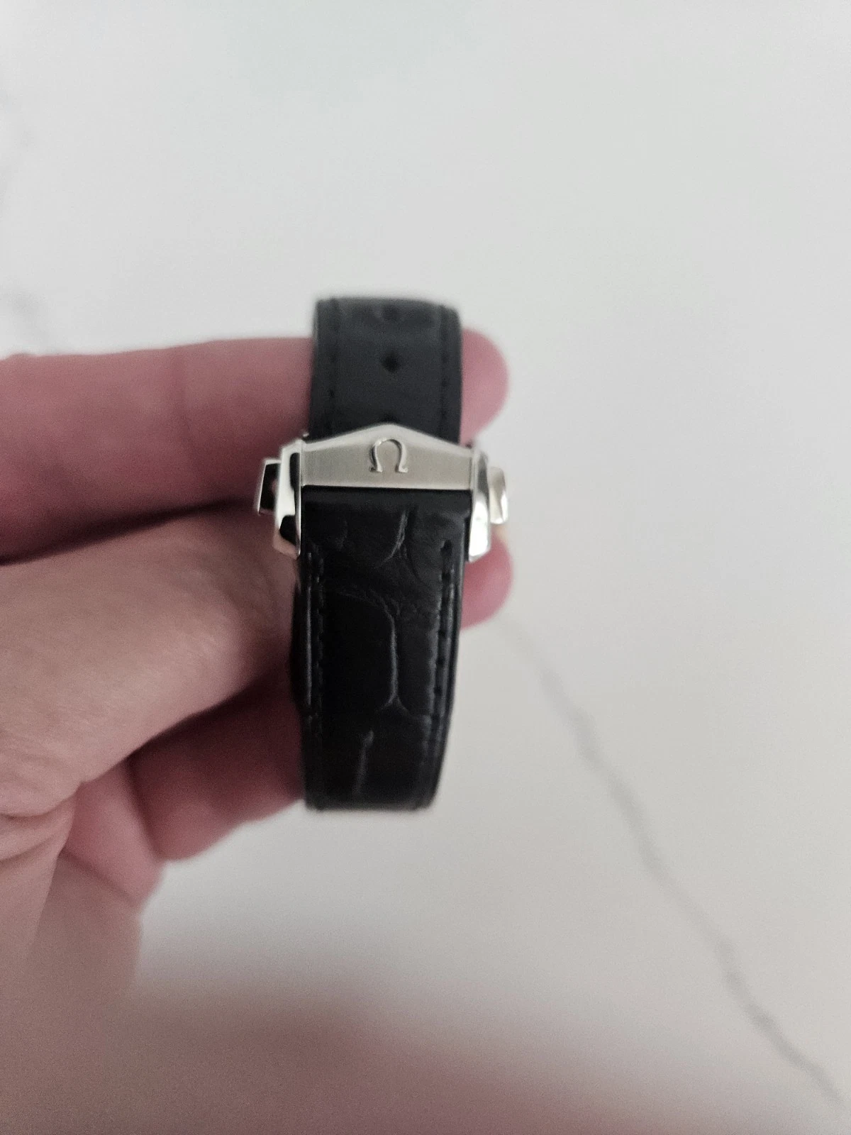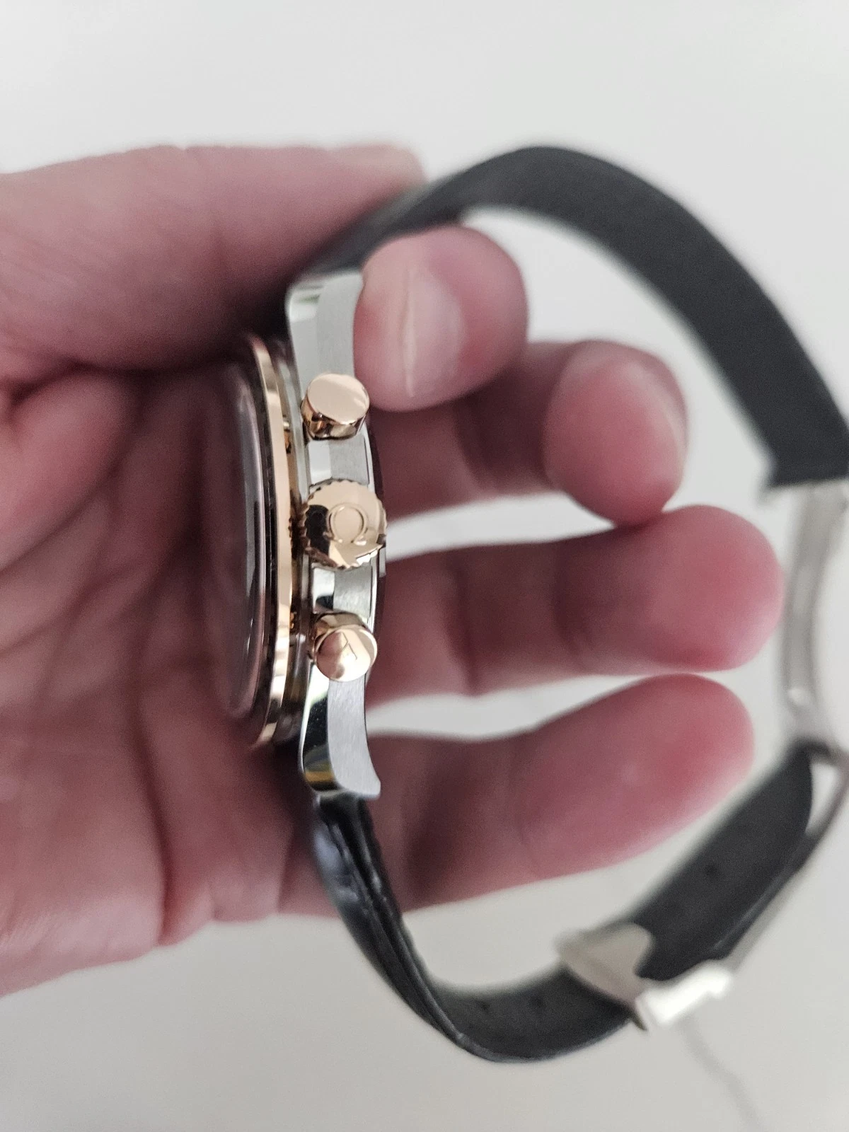 The sun brushed, PVD treated Sedna Gold dial showcases applied logos, indices, and 18K Sedna Gold hands. Subdials include a small seconds, 30 minute recorder, and a 12 hour recorder, all framed by a sleek black alligator strap. At its heart is the manual winding OMEGA Co-Axial Master Chronometer Caliber 3861, certified by METAS and highly resistant to magnetic fields up to 15,000 gauss.