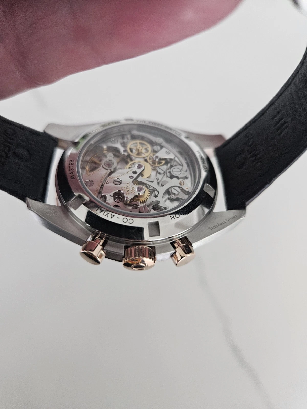 The OMEGA Speedmaster Moonwatch Professional in Sedna Gold is an extraordinary timepiece, celebrating OMEGA's rich history and pioneering legacy. Inspired by the iconic chronograph that journeyed to the moon, this 42mm model pairs stainless steel with exclusive 18K Sedna Gold for an elegant two tone finish. The sapphire crystal glass on both the front and caseback reveals its intricate craftsmanship. The design reflects the classic, 4th-generation Speedmaster style, featuring a black ceramic bezel with OMEGA Ceragold tachymeter markings, including the sought after "dot over ninety."