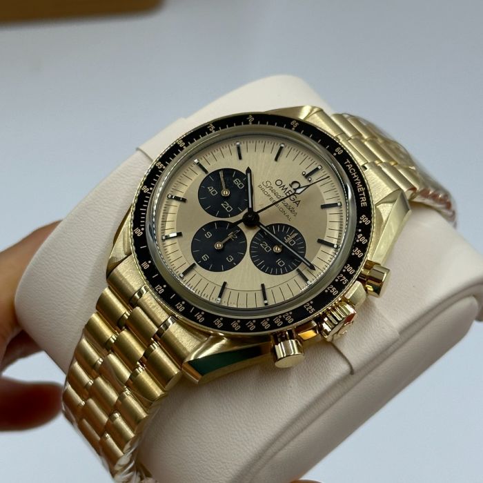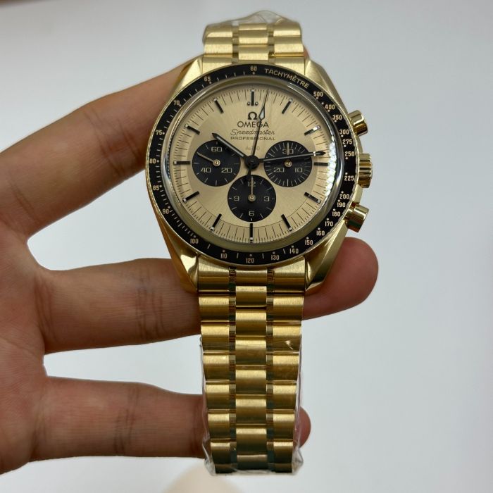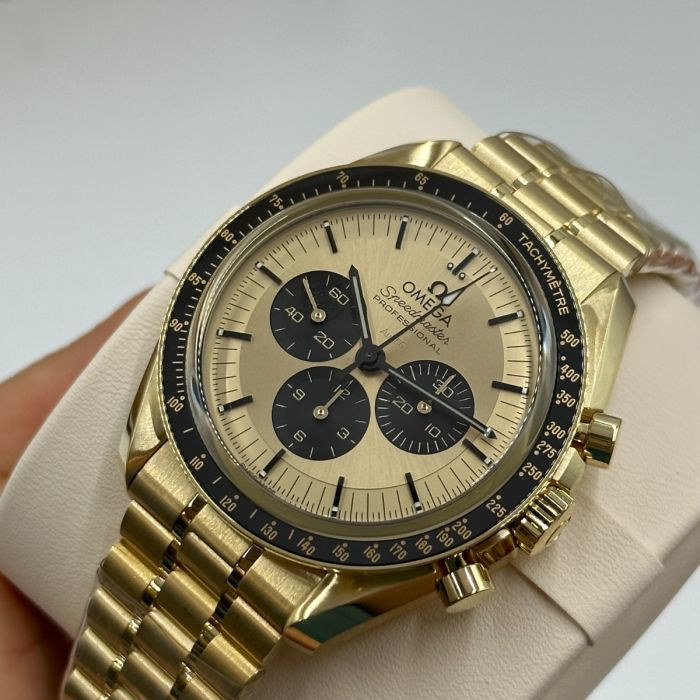 The caseback, also in polished 18K Moonshine™ Gold, bears double bevels and is engraved with the iconic words "FIRST WATCH WORN ON THE MOON" in black. Powering this timepiece is Omega's Co-Axial Master Chronometer Calibre 3861 with a special luxury finish. It incorporates cutting-edge components, from the Co-Axial escapement for enduring precision to the silicon balance spring for remarkable anti-magnetic properties.