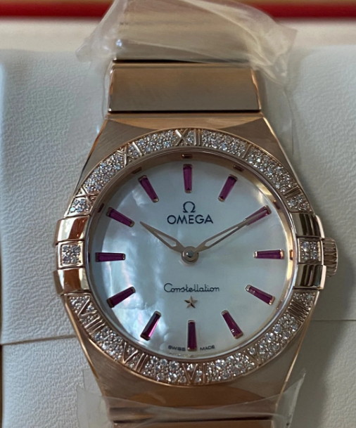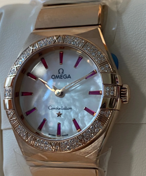 Calibre OMEGA 4061: Quartz movement with "Long Life" feature to maximize the autonomy of the battery. Exclusive red OMEGA logo with rhodium plated parts and circular graining.