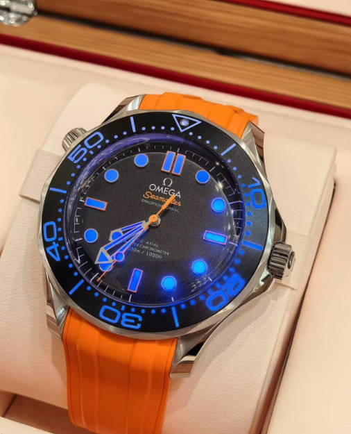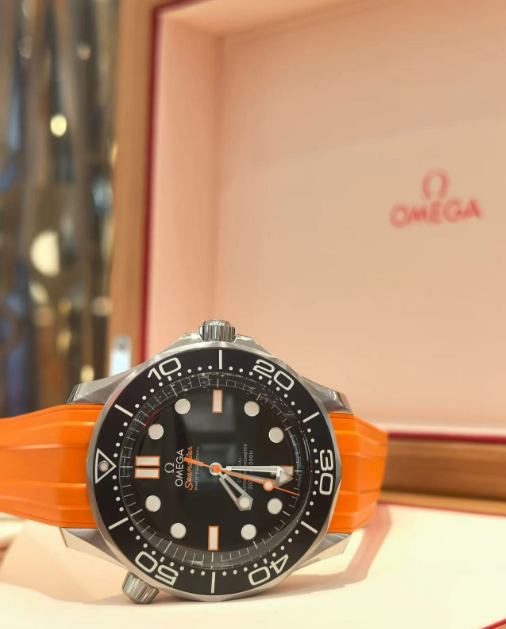 An integrated orange rubber strap adds a sporty edge and all-day comfort, fastened securely with a foldover clasp. True to its professional roots, the Diver 300M retains essential features like the helium escape valve, screw-down crown, scalloped unidirectional bezel, and crown guards—all designed for function and flair. A domed sapphire crystal with anti-reflective treatment ensures clarity at every angle, while the display caseback reveals the METAS-certified OMEGA Co-Axial Master Chronometer Caliber 8806. This self-winding movement offers superior precision, anti-magnetism, shock resistance, and a 55-hour power reserve.