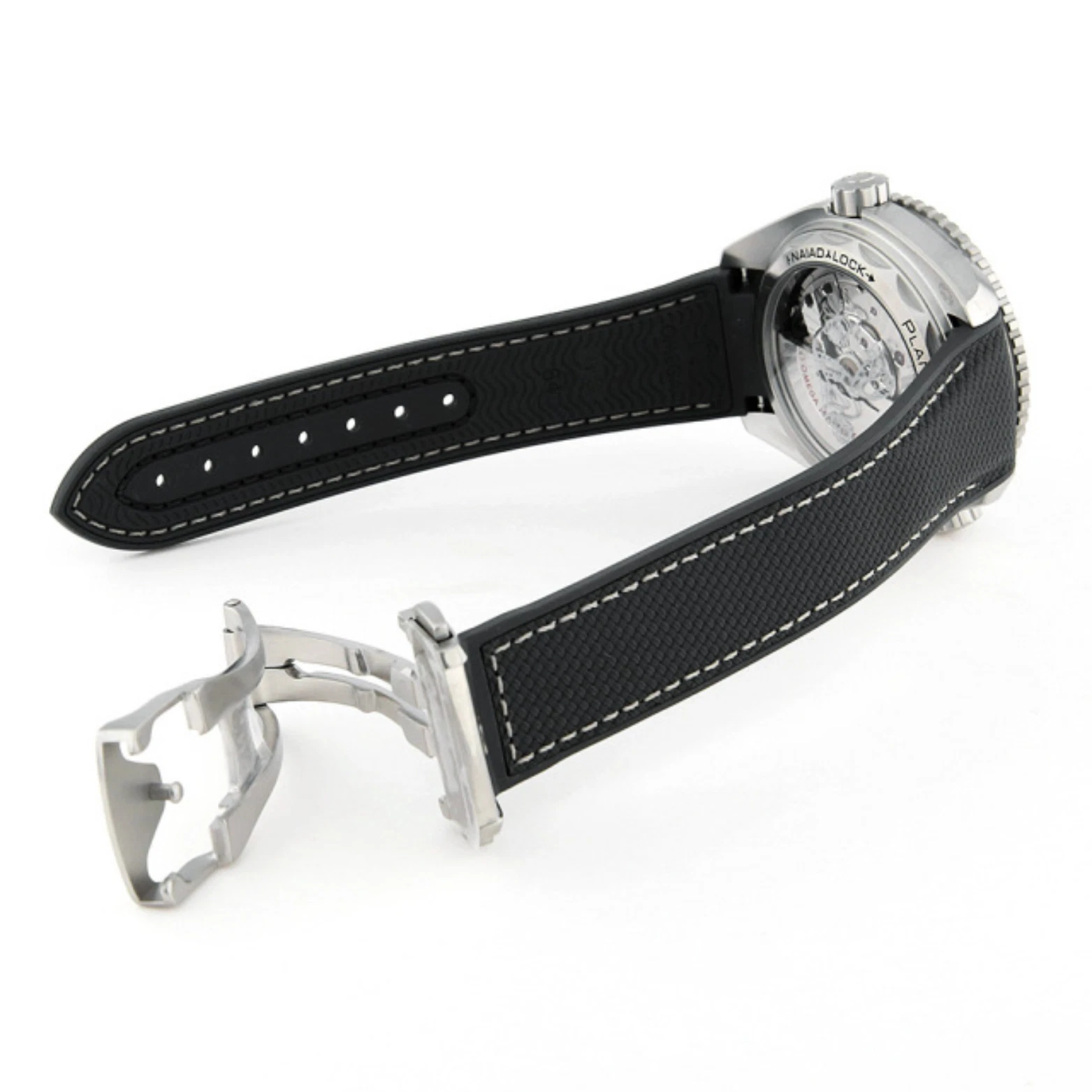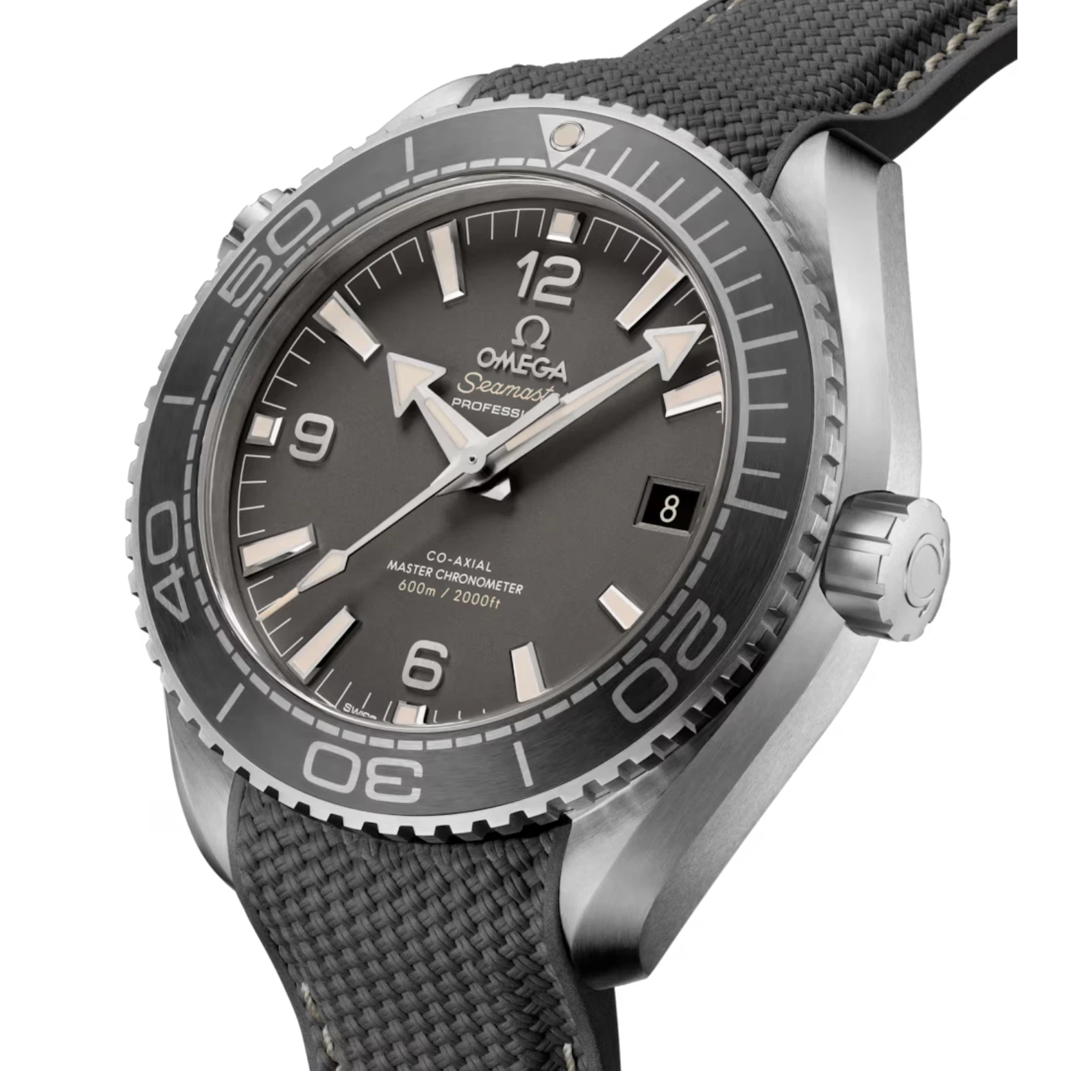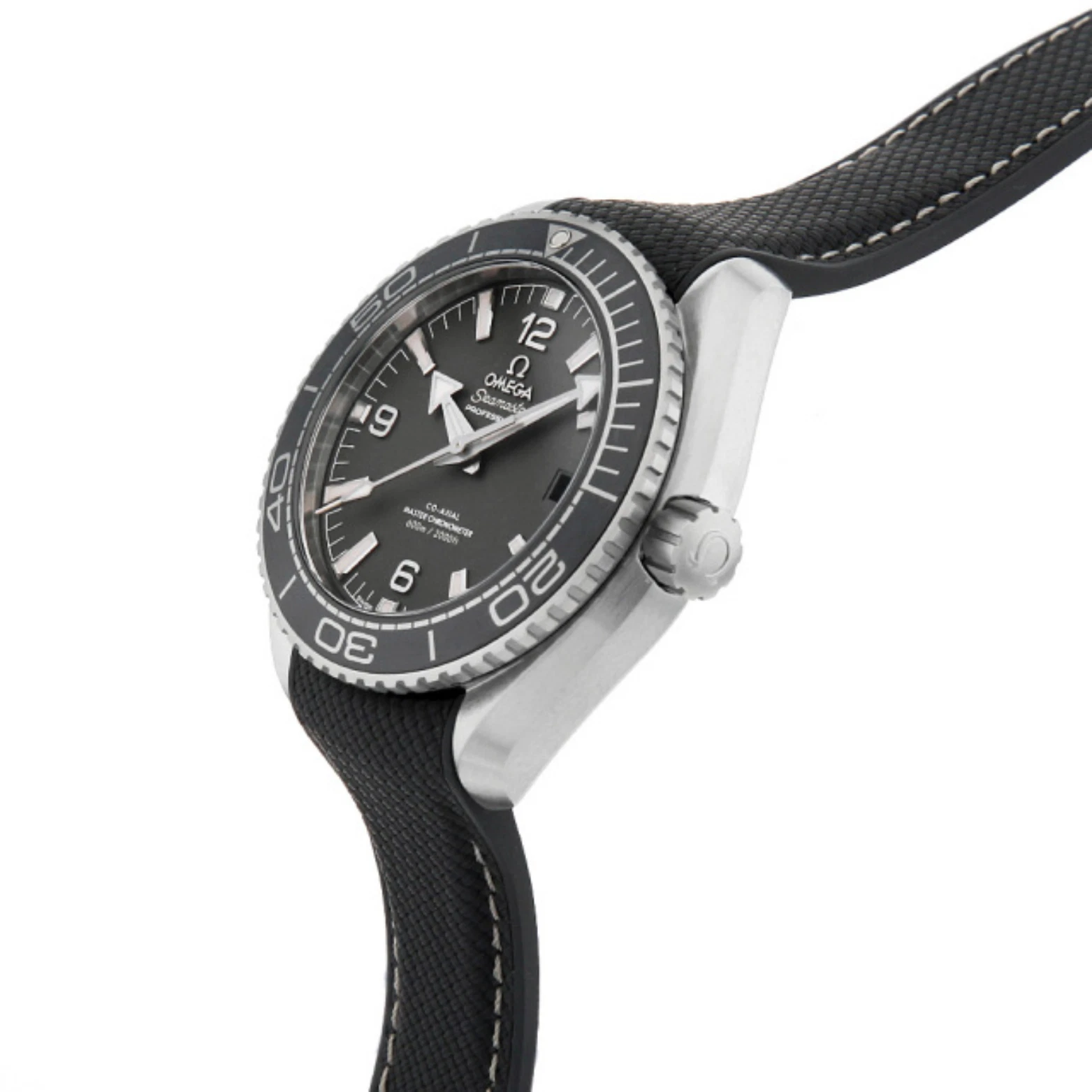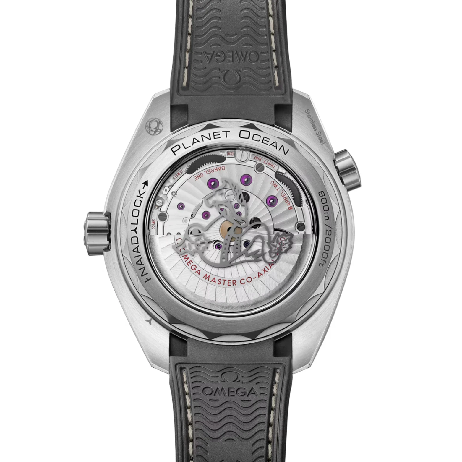 Powered by the Co-Axial Master Chronometer Calibre 8900, this Seamaster Planet Ocean is worn on an integrated dark grey rubber strap with a structured pattern and beige and dark grey stitching. The NAIAD LOCK caseback is completed with a metallized seahorse on the sapphire crystal.