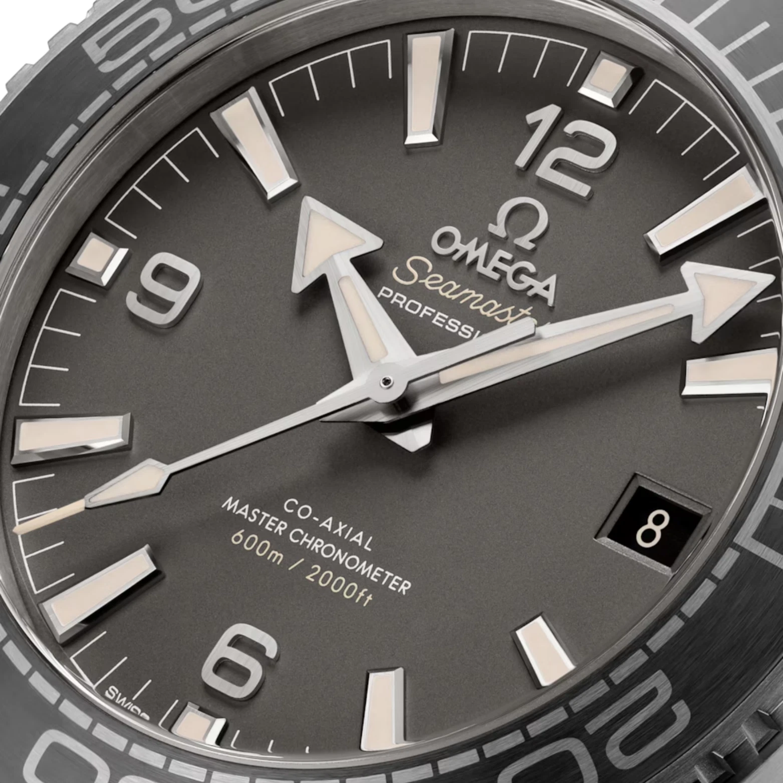 The dial is presented with a sand-blasted “gunmetal” grey galvanic treatment and includes a date window at 3 o’clock, along with transferred words in beige and white. The OMEGA logo, Arabic numerals, hands, and hour markers are all in PVD stainless steel with a brushed finish, while the beige Super-LumiNova improves visibility in dark conditions.