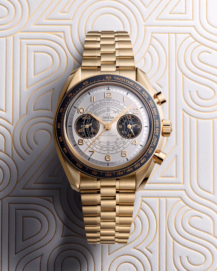 • Bezel: fixed, ceramic and 18kt moonshine yellow gold, tachymeter scale in omega ceragold™