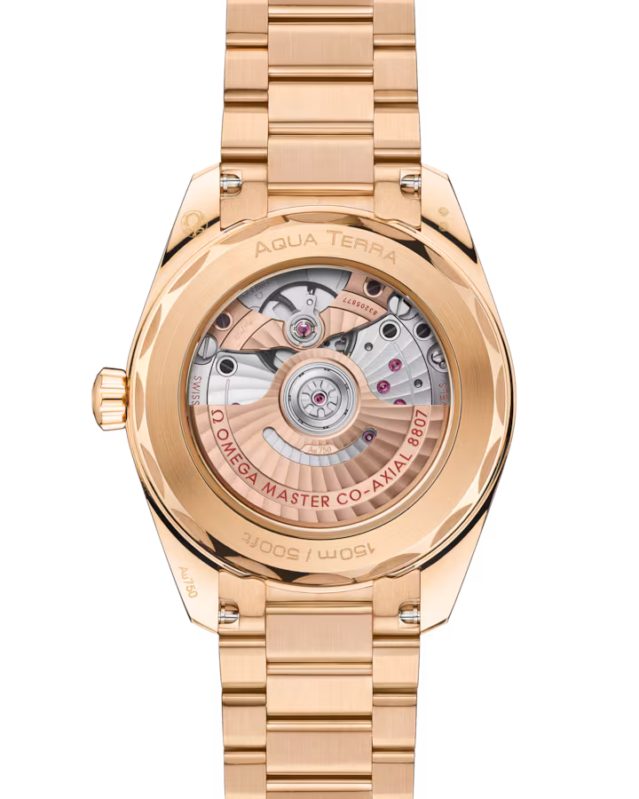 Unworn Omega Seamaster AQUA TERRA 150M CO‑AXIAL MASTER CHRONOMETER 220.55.34.20.99.002. 34 mm, White dial, Sedna™ Gold case, Sedna™ Gold bezel, 8807 calibre, Self Winding Movement, 55 Hours power reserve, Sedna™ Gold bracelet with Butterfly clasp. Water resistant to 150 m.