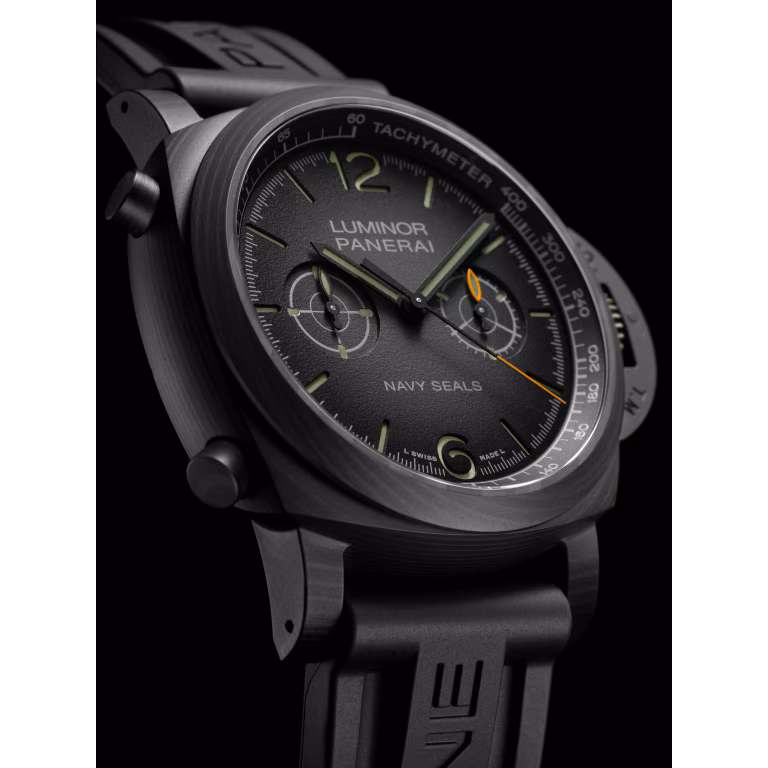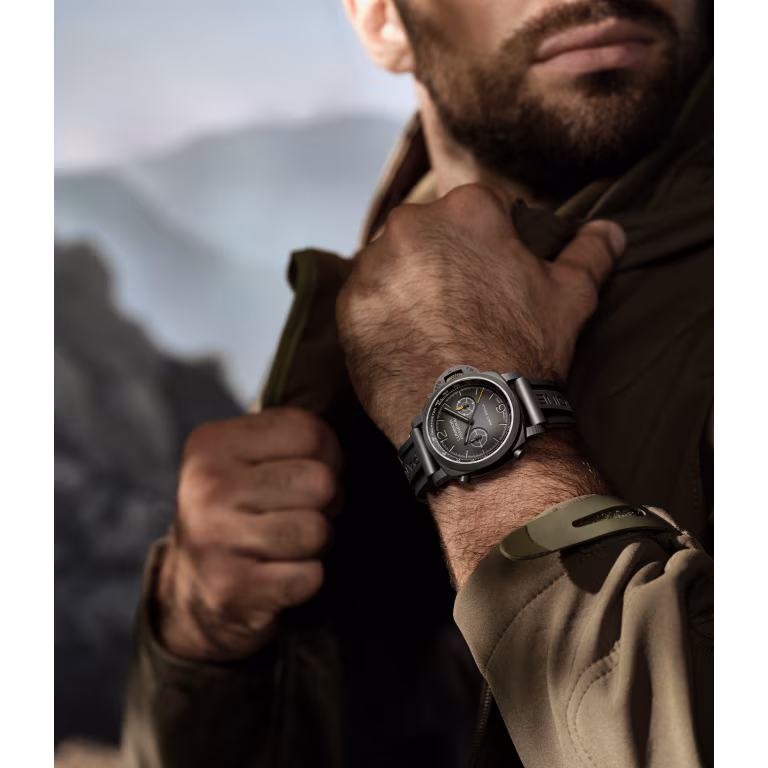 Dégradé black grené with luminous arabic numerals and hour markers. Hollowed chronograph minutes counter at 3 o’clock and small seconds counter at 9 o’clock. Central chronograph seconds hands. Tachymeter scale in the external “rehaut