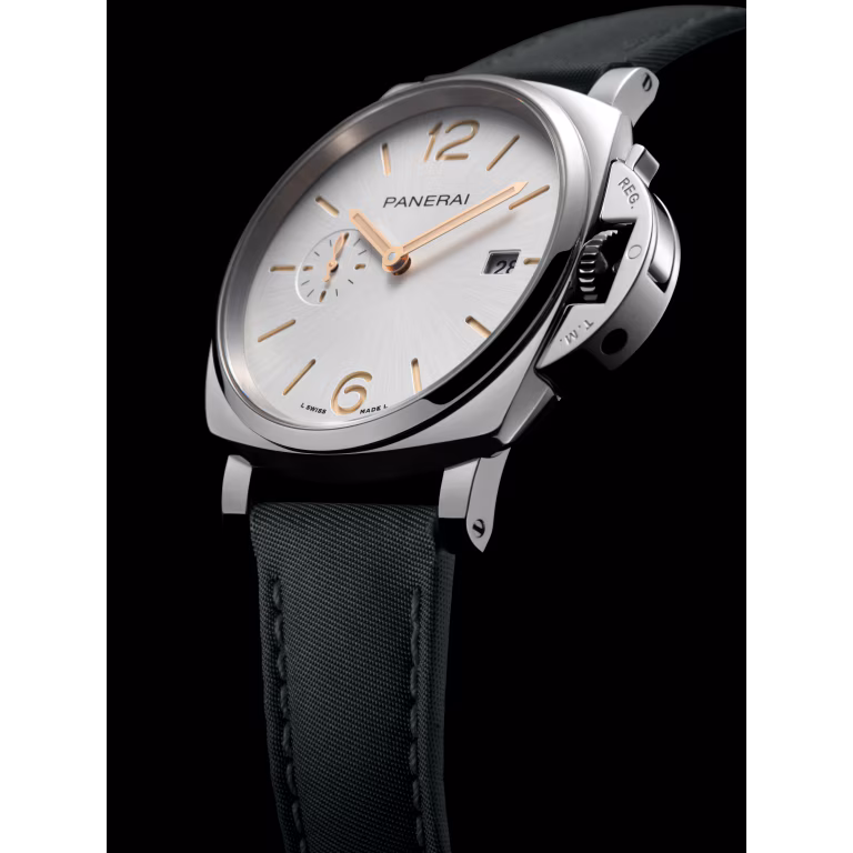 White sun-brushed with luminous Arabic numerals and hour markers. Date at 3 o'clock and small seconds at 9 o'clock