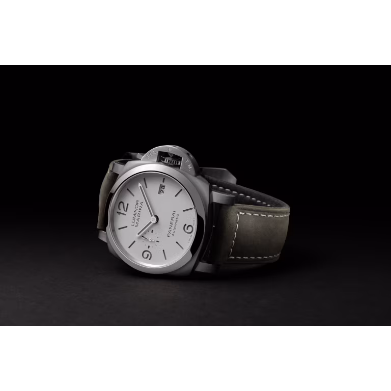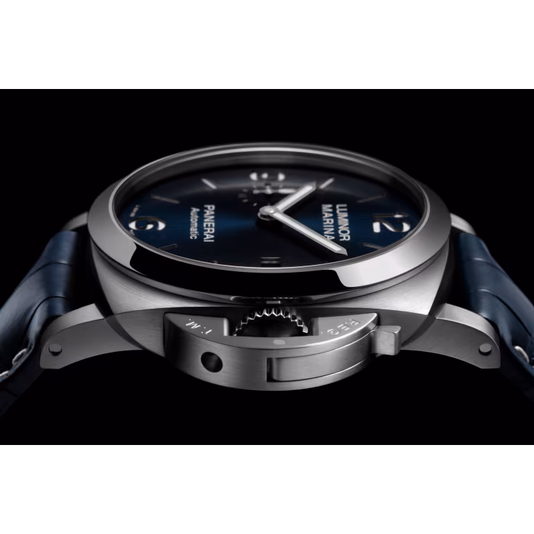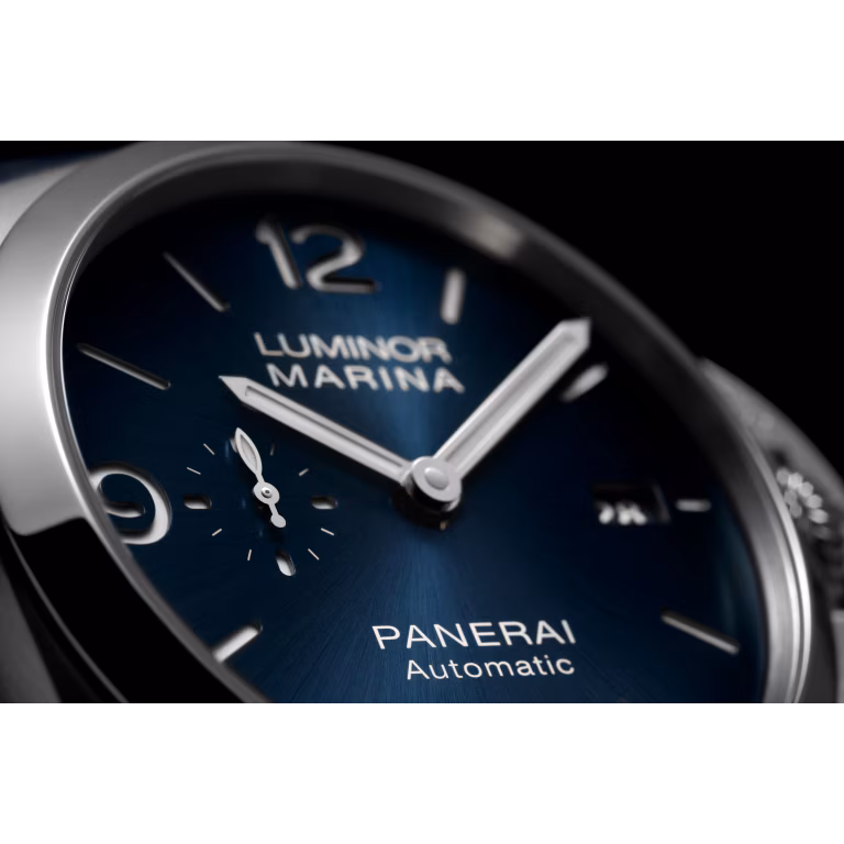 Blue sun-brushed with luminous Arabic numerals and hour markers. Date at 3 o'clock and small seconds at 9 o'clock