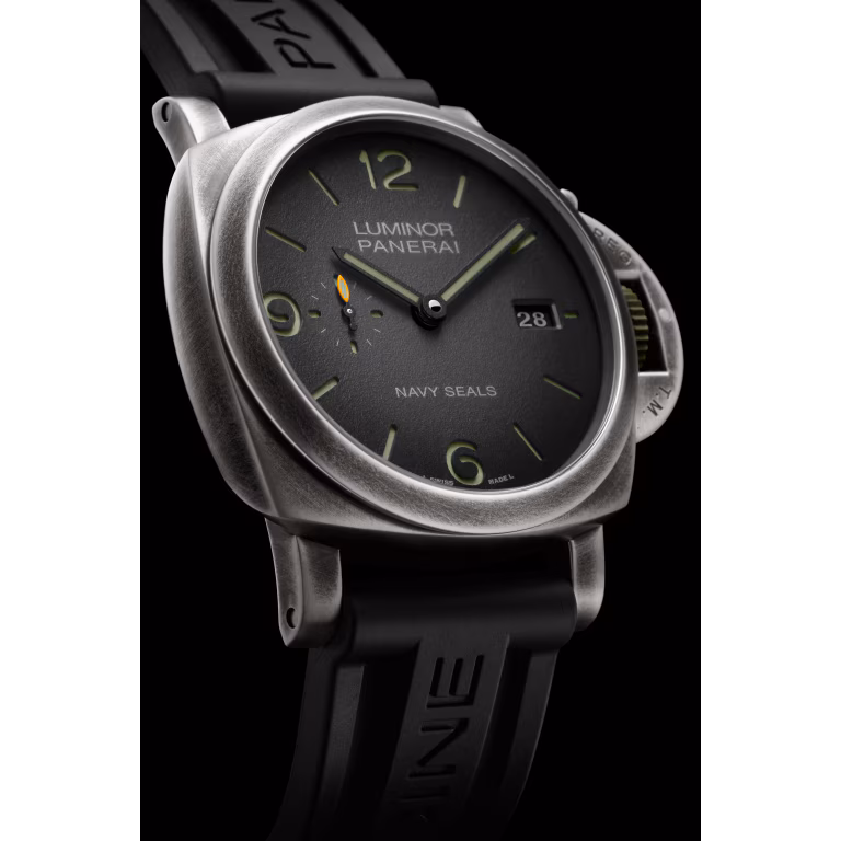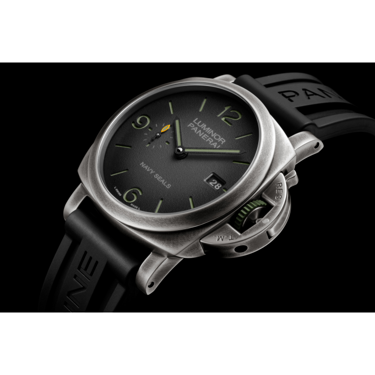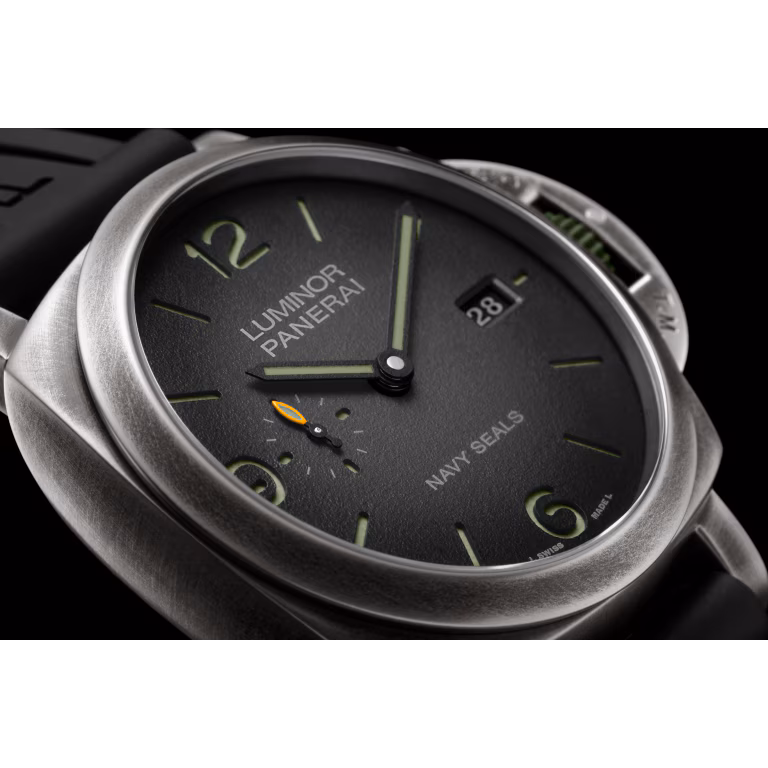 Green shaded with luminous Arabic numerals and hour markers. Date at 3 o'clock and small seconds at 9 o'clock.