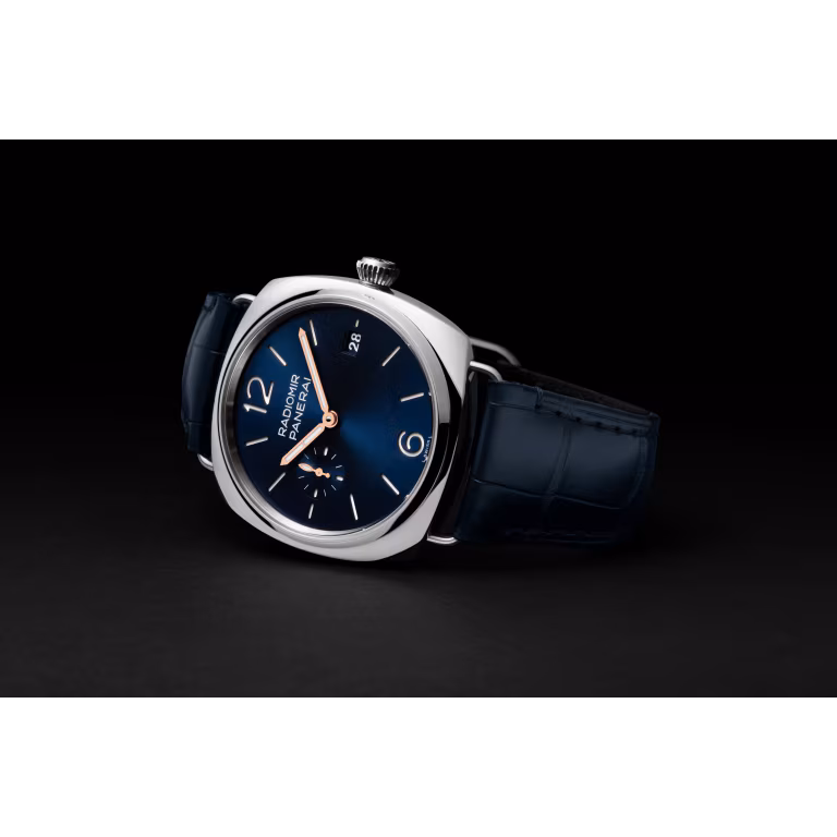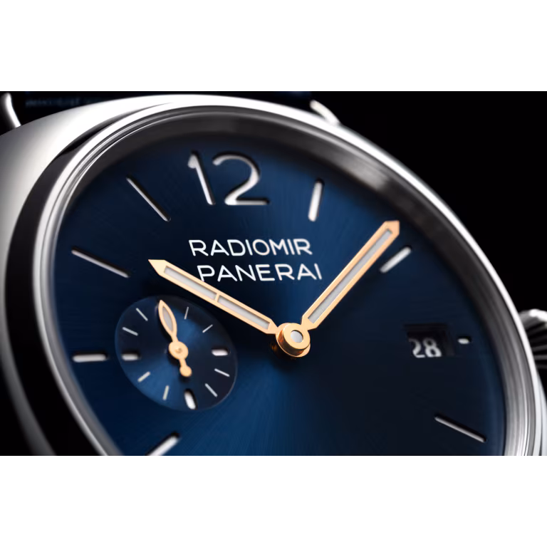 Blue sun-brushed with luminous Arabic numerals and hour markers. Date at 3 o'clock and small seconds at 9 o'clock