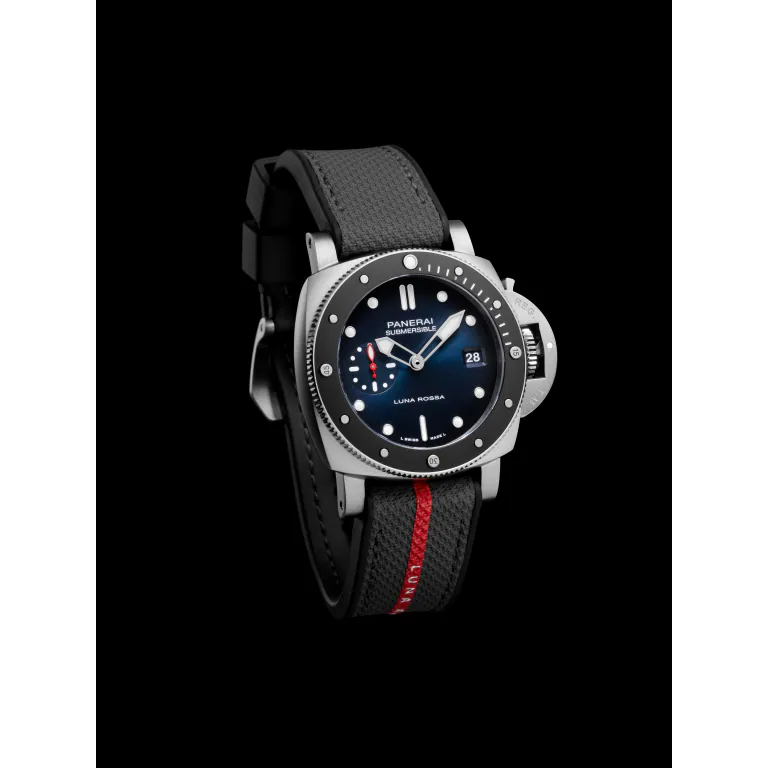 Blue sun-brushed with luminous hour markers and dots. Date at 3 o’clock, small seconds at 9 o’clock