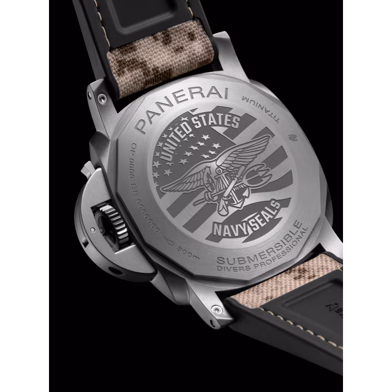 Black shaded with luminous hour markers and dots. Date at 3 o’clock, small seconds at 9 o’clock.