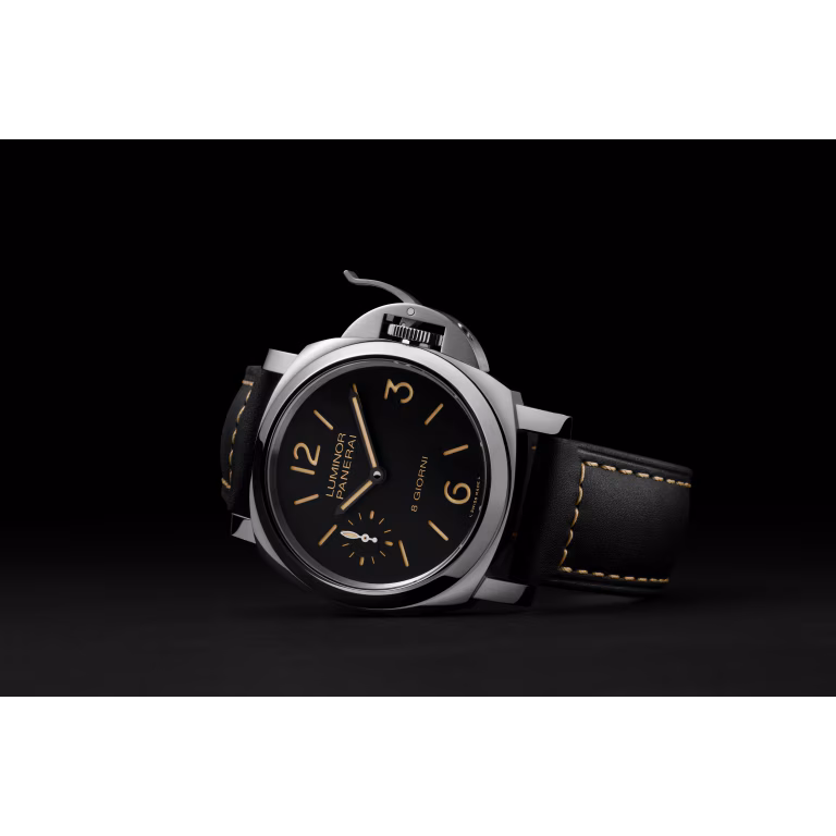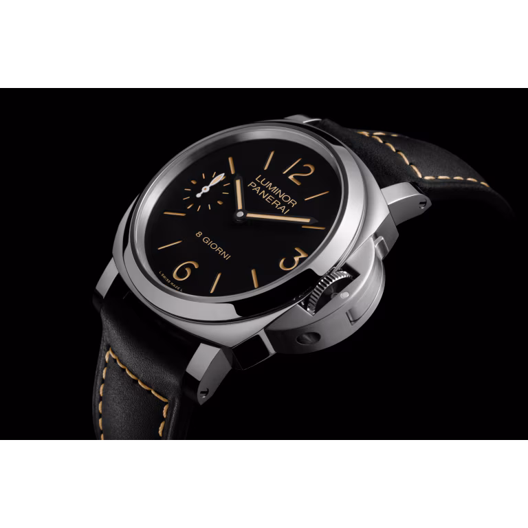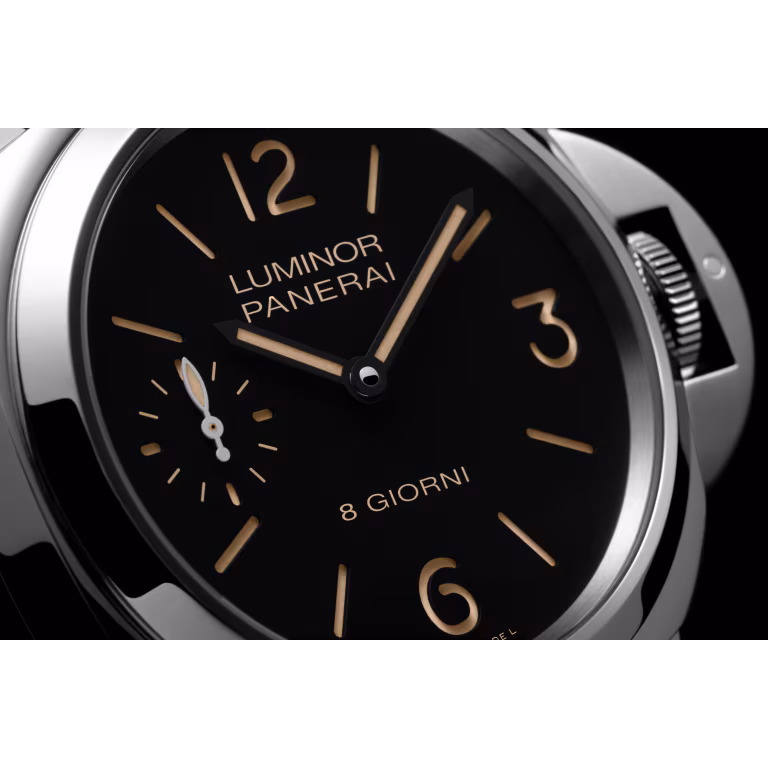 Black with luminous Arabic numerals and hour markers. Small seconds at 9 o'clock