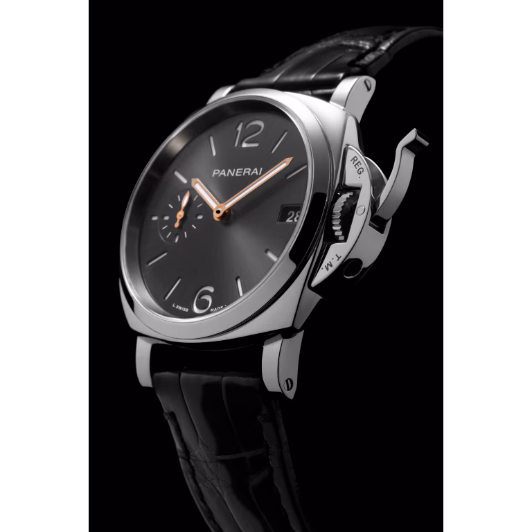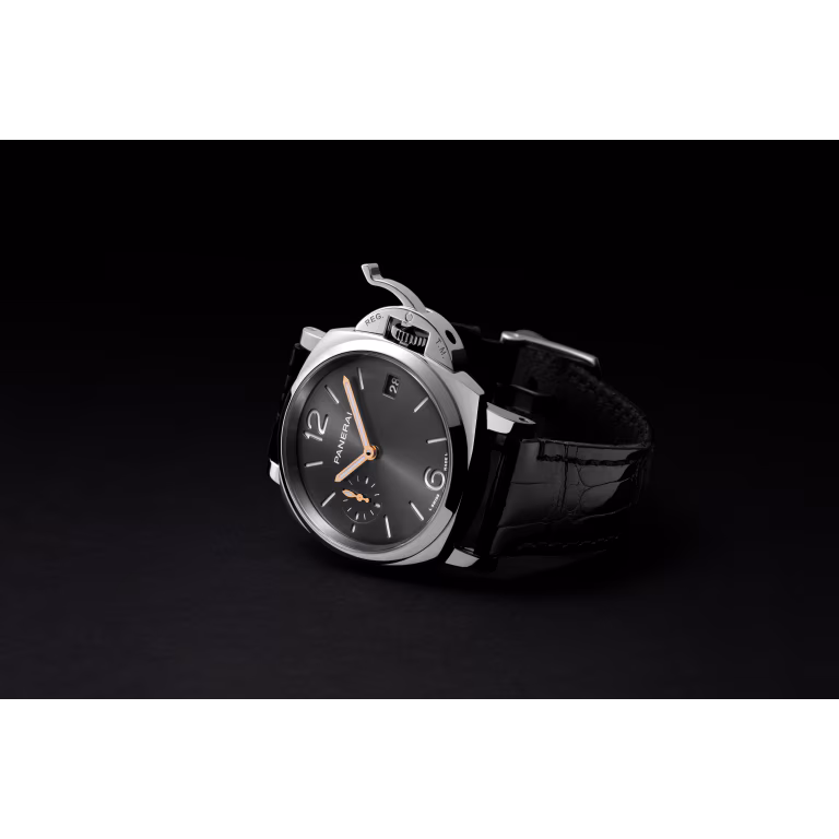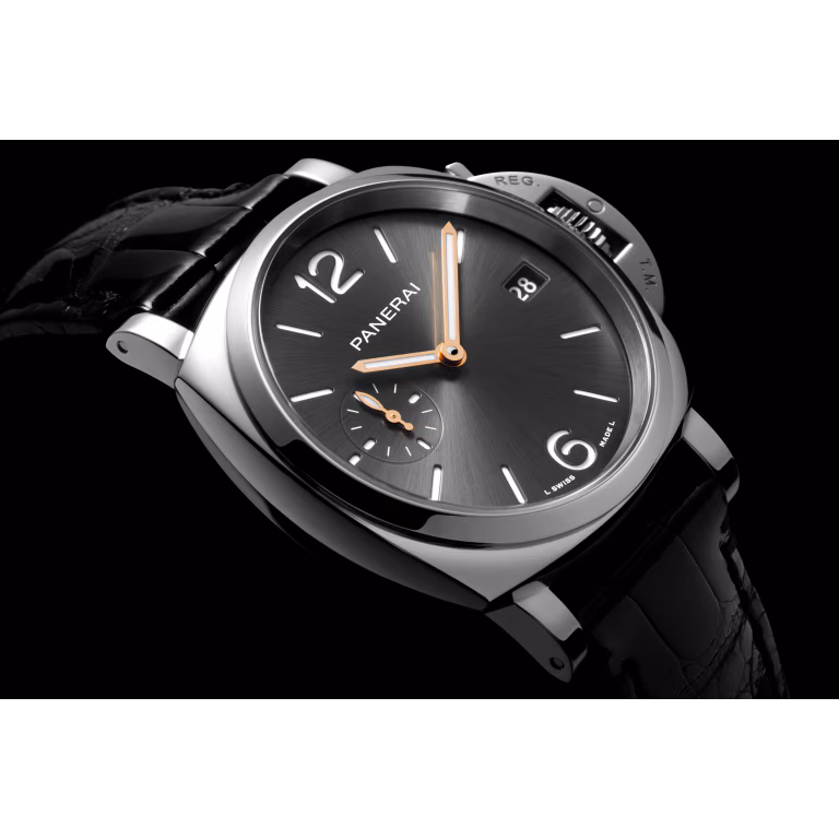 Anthracite sun-brushed with luminous Arabic numerals and hour markers. Date at 3 o'clock and small seconds at 9 o'clock.
