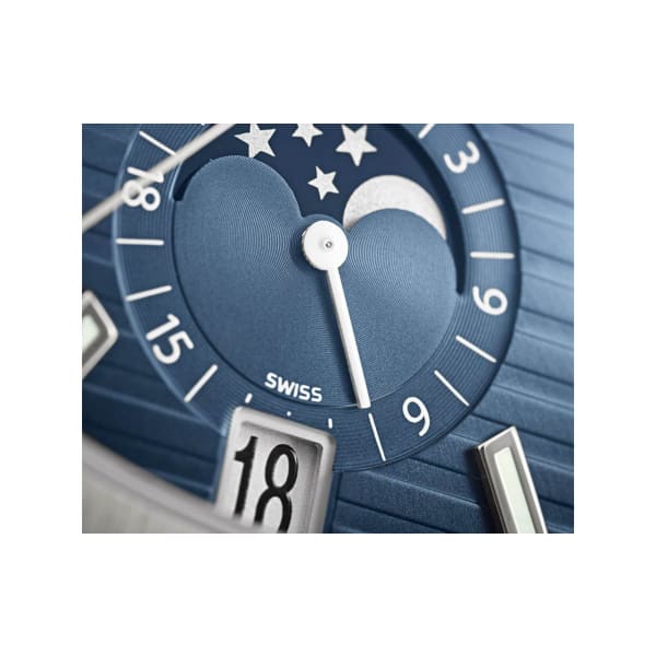 Features Day, date, month in apertures. Moon phases. 24-hour indication. Sweep seconds hand.