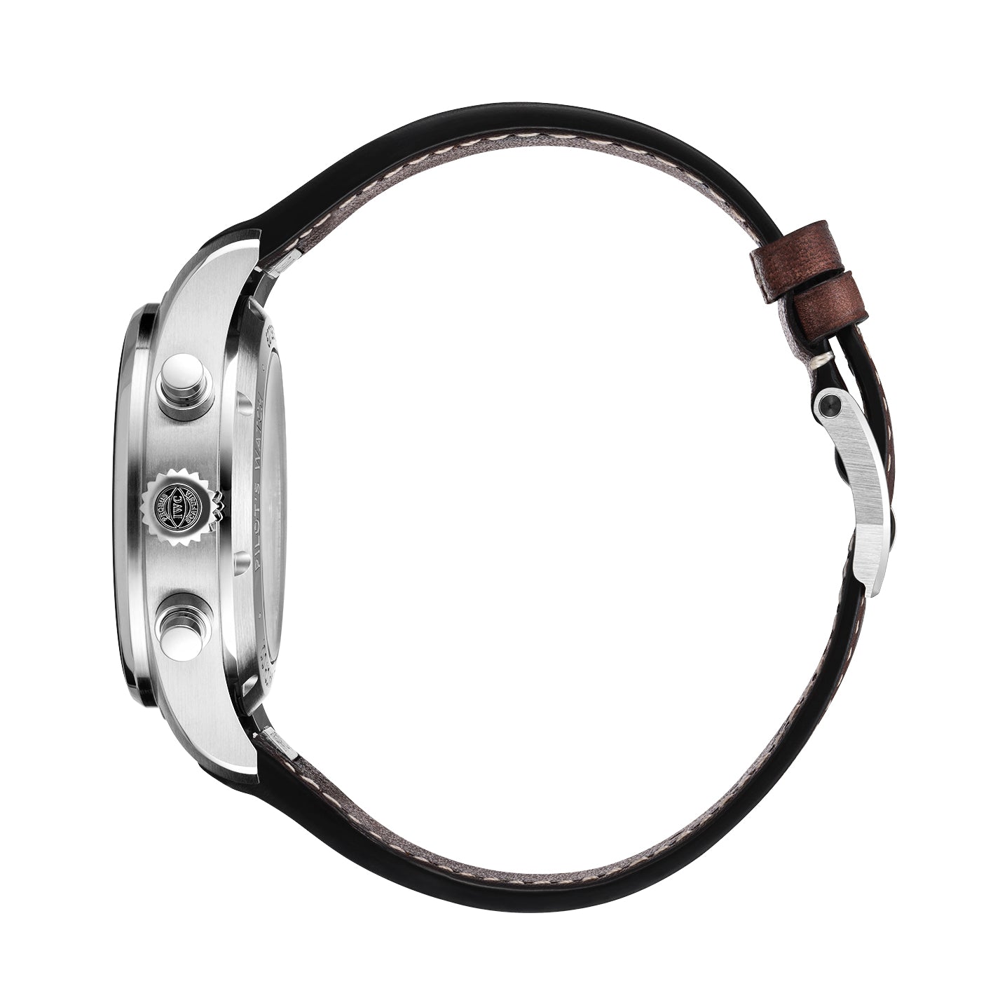 This statement pilot's watch is housed within an ergonomic 41mm stainless steel case, with a classic deep brown leather strap featuring contrasting stitching and secured with the EasX-CHANGE system.